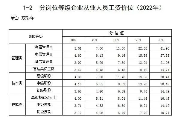 人社部于6月25日发布了2022年企业薪酬调查信息,其中公布了不同职业企业从业人员工资价位以及不同岗位等级企业从业人员工资价位数据。