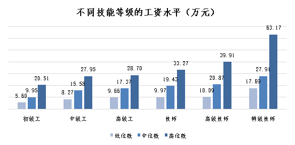 从工资中位数来看,首席技师的工资是初级工的3倍以上。具体来说,首席技师、特级技师、高级技师、技师、高级工、中级工、初级工的工资分别为30.33万元、27.91万元、20.87万元、19.43万元、17.37万元、15.58万元和9.95万元。