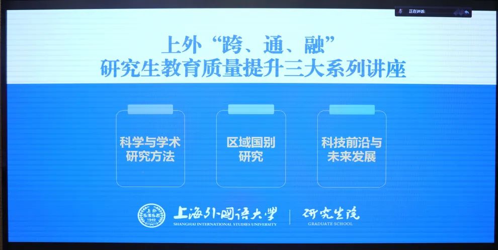 《田野调查方法与实践——海外一千天》是上外“跨、通、融”研究生教育质量提升三大系列讲座的第二场,也是“区域国别研究”系列讲座的第一场。作为国内首个将国别区域研究作为学校发展战略的高校,上外近年来在理念创新、实践创新和话语创新方面持续发力,紧紧抓住“会语言、通国家、精领域”的卓越区域国别人才特征,以培养学生的“政治定力、语言能力、学科能力、话语能力”为目标。上外非常重视培养学生的科技前沿与未来发展意识,并注重培养学生的学术研究方法。