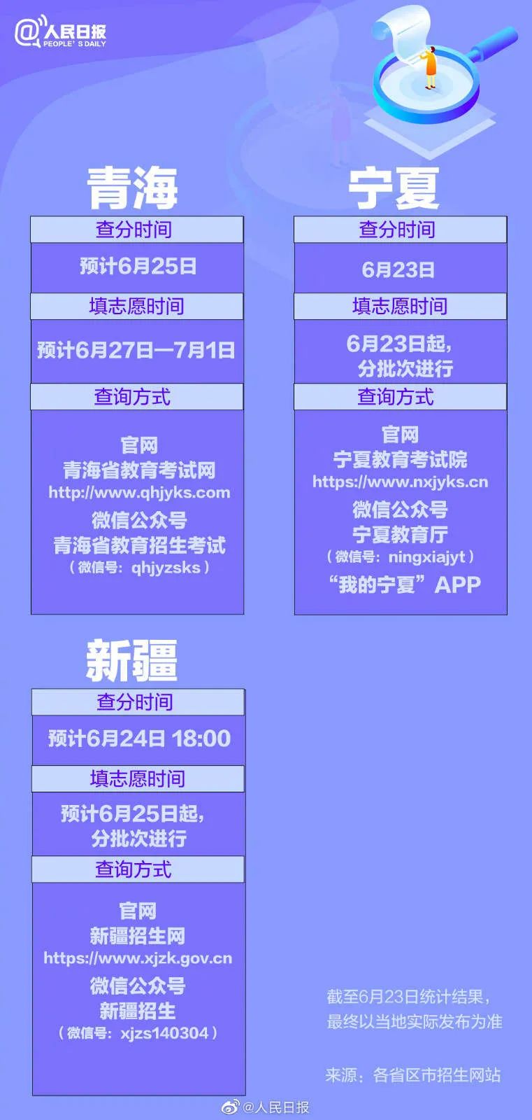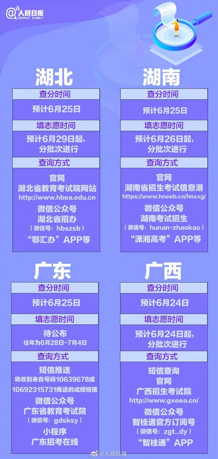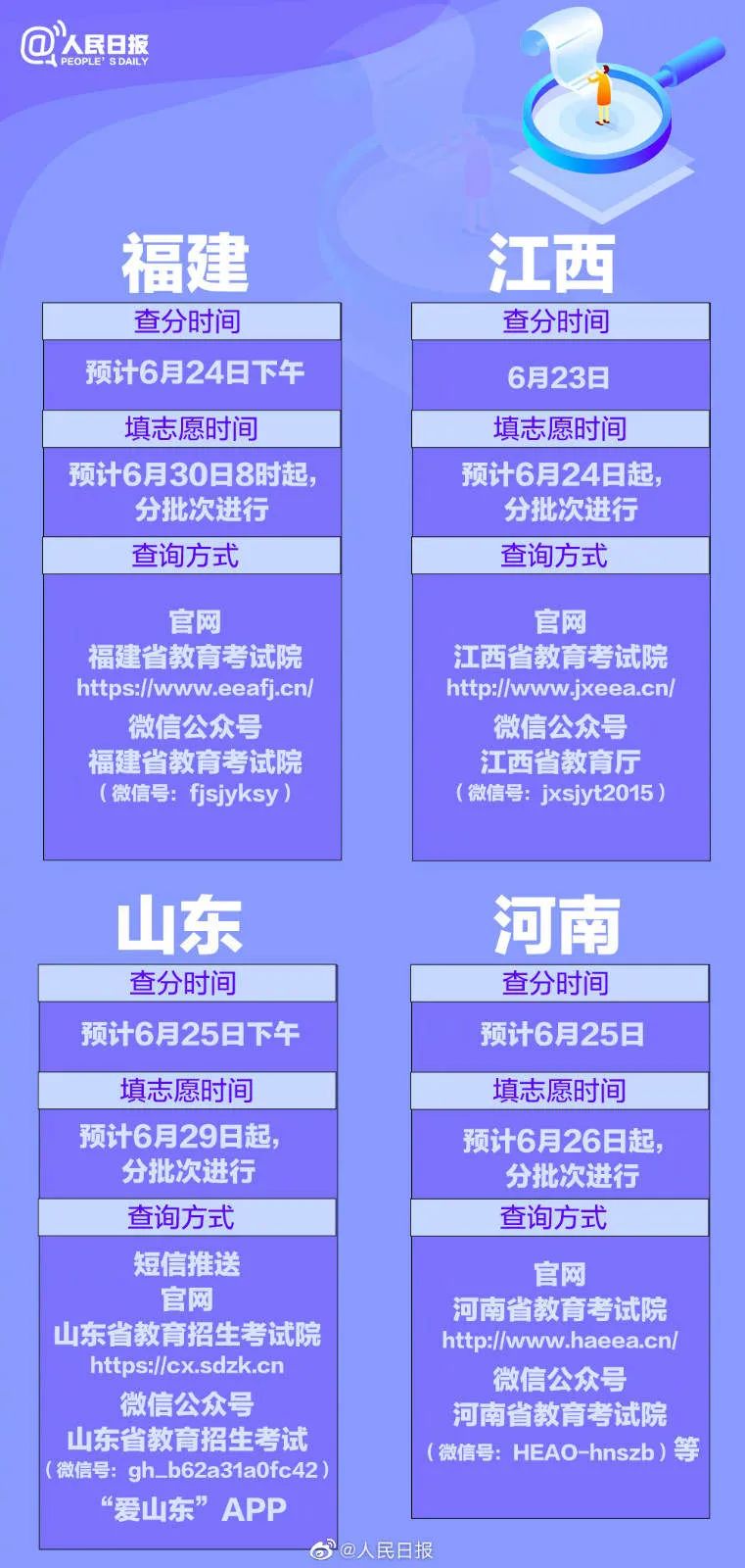 从6月23日起,各地的高考成绩将陆续公布。同时,多个省区市的志愿填报安排也已公布。@1291万考生,你们准备好了吗?31个省份的报志愿时间已经全部汇总,祝考生金榜题名,愿他们继续精彩!