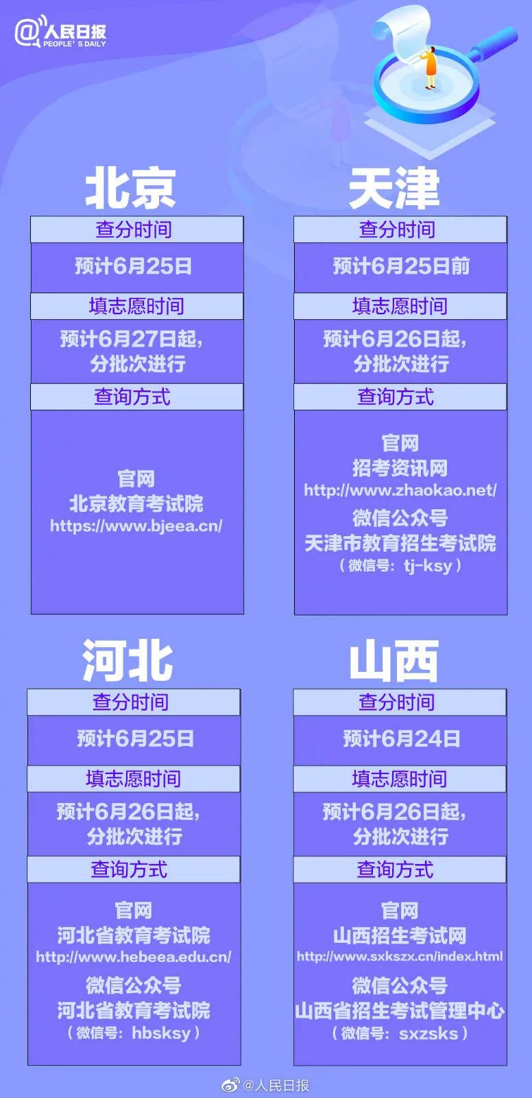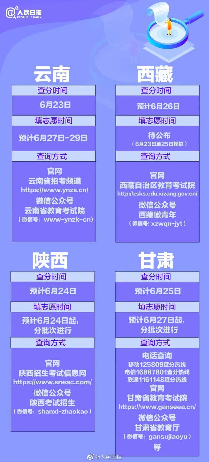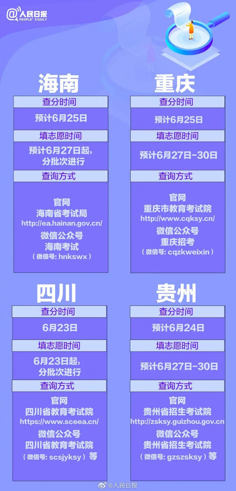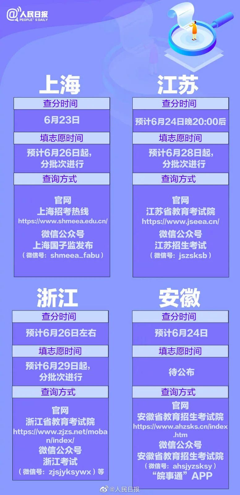 从6月23日起,各地的高考成绩将陆续公布。同时,多个省区市的志愿填报安排也已公布。@1291万考生,你们准备好了吗?31个省份的报志愿时间已经全部汇总,祝考生金榜题名,愿他们继续精彩!