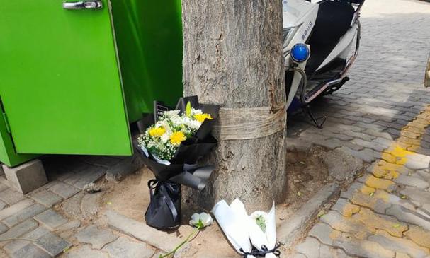 在爆炸事故发生地封闭路段的一端,人们摆放了花束。图源:澎湃新闻。