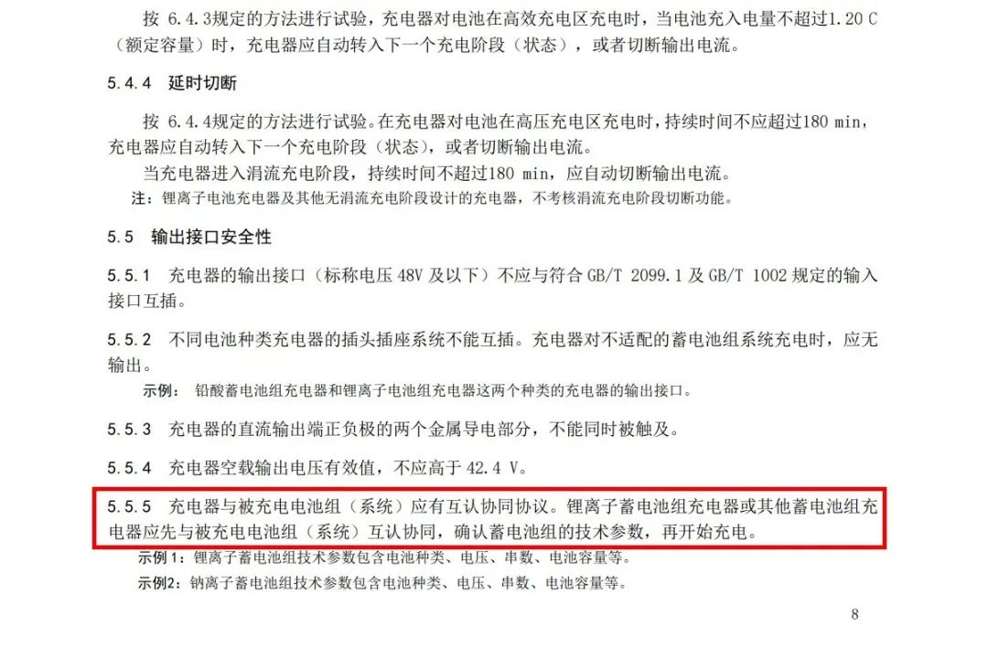 第5.5.5条规定,充电器与被充电电池组(系统)之间应有互认协同协议。对于锂离子蓄电池组充电器或其他蓄电池组充电器,应先与被充电电池组(系统)进行互认协同,确认蓄电池组的技术参数后,再开始充电。