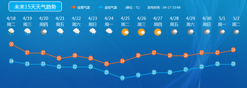 4月18日: 多云,午后转雷阵雨,23~30C;