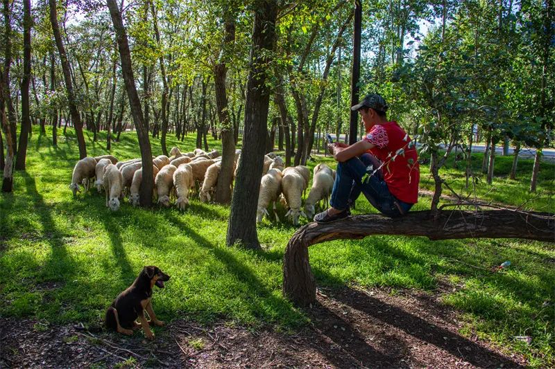 2017年8月24日,一位青年在牧场防护林里放牧。