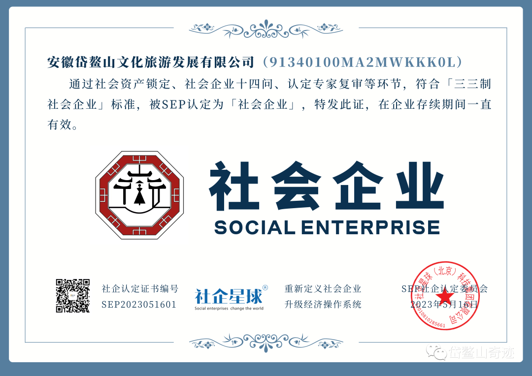 岱鳌山文旅公司,成为安徽省第一家经专业机构社企星球认证的社会企业。