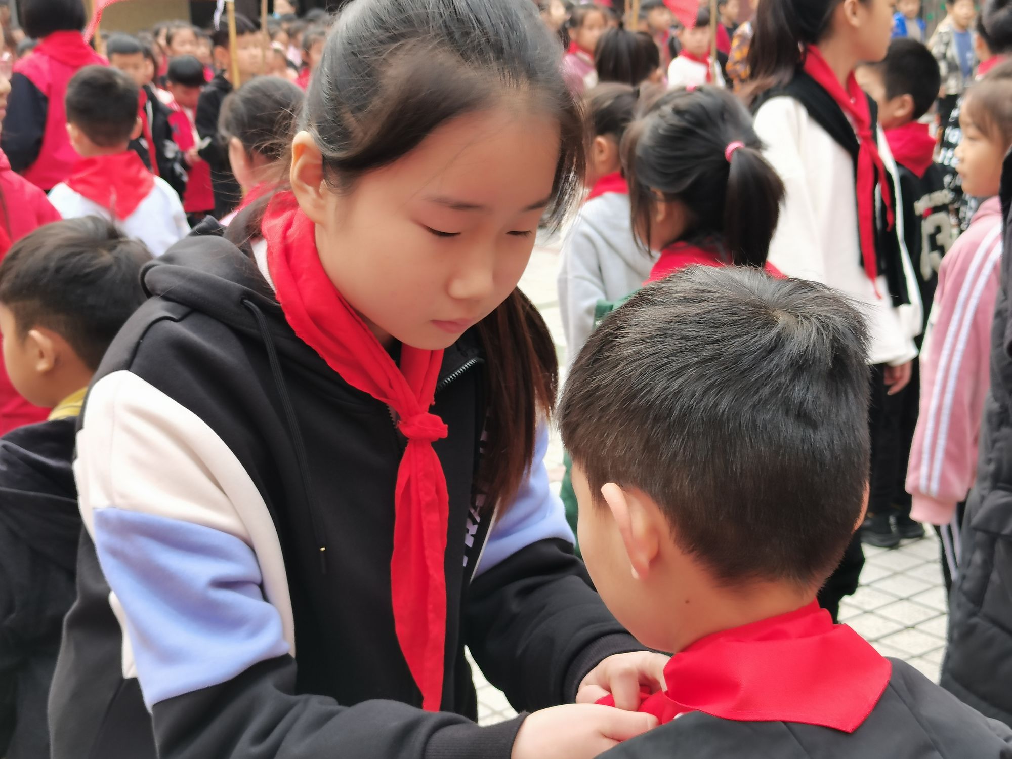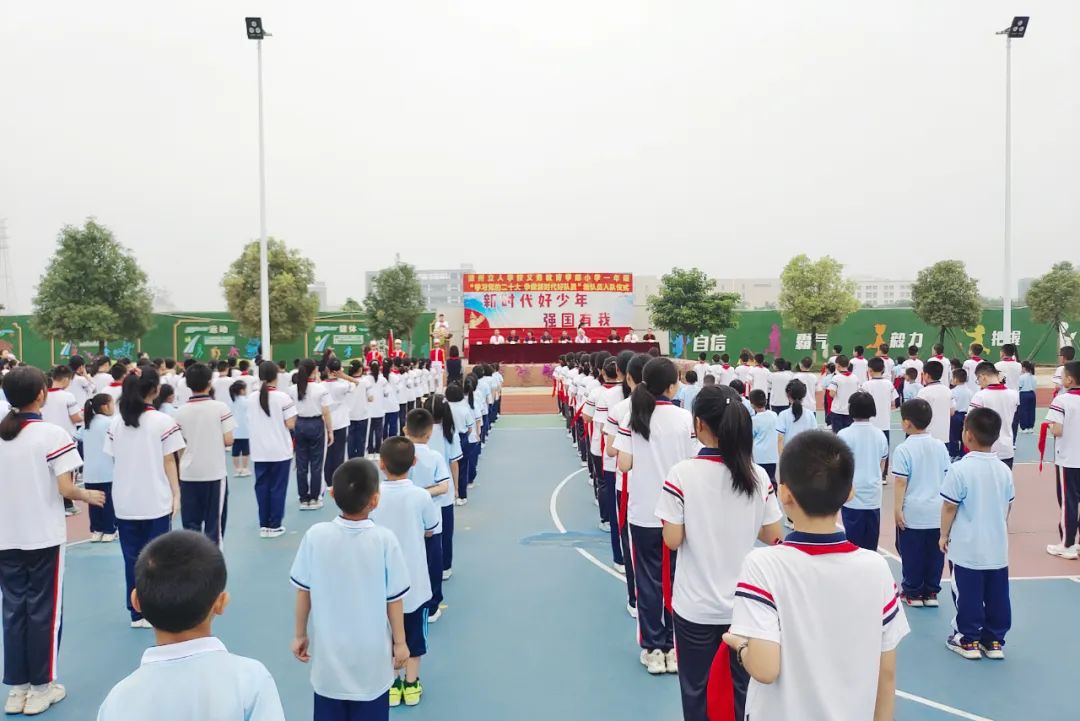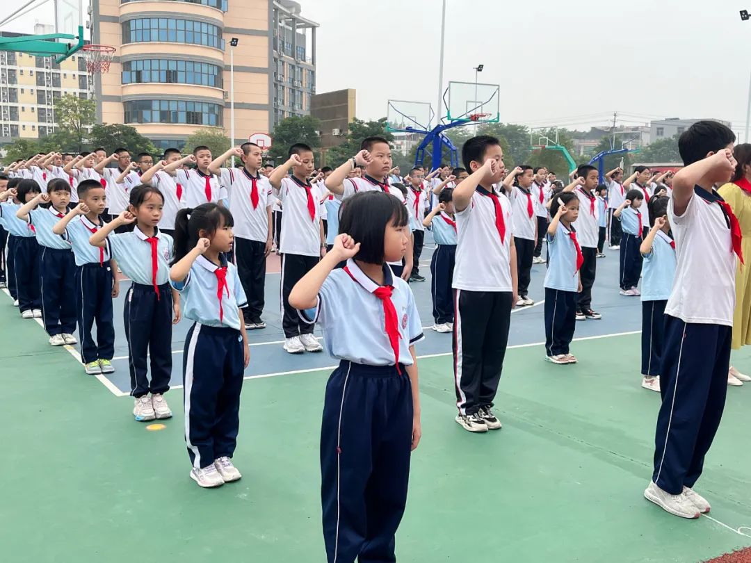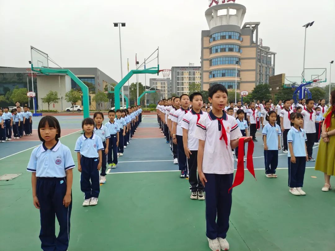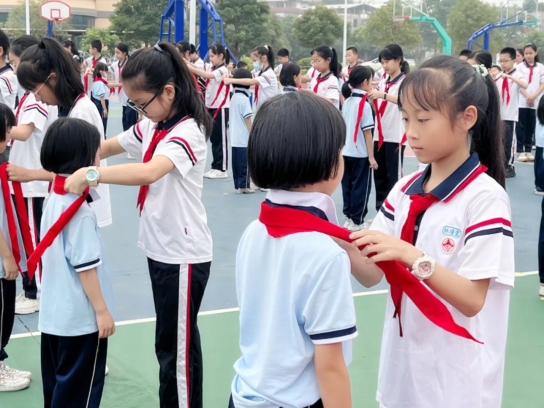 五年级的老队员们为新队员们佩戴了崭新的红领巾。80位一年级的同学们正式成为了一名少先队员!他们戴上了象征着责任和光荣的红领巾,在鲜艳的队旗下庄严地宣誓。