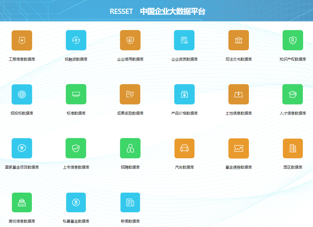 RESSET企业大数据平台是一个专业服务于科研、教育、生产等领域,协同并集成化企业数据整合检索平台。该平台提供全面、精准、权威的企业数据信息,为用户提供十四大专业数据库产品,包括工商信息数据库、投融资数据库、企业信用数据库、企业资质数据库、司法文书数据库、知识产权数据库、查招标数据库、标准数据库、成果奖励数据库、产品数据库、土地数据库、人才数据库、国家基金数据库和上市信息数据库。这些数据库覆盖了企业信息、企业发展、经营状况、守法守规、知识产权、成果奖励等全维度信息。