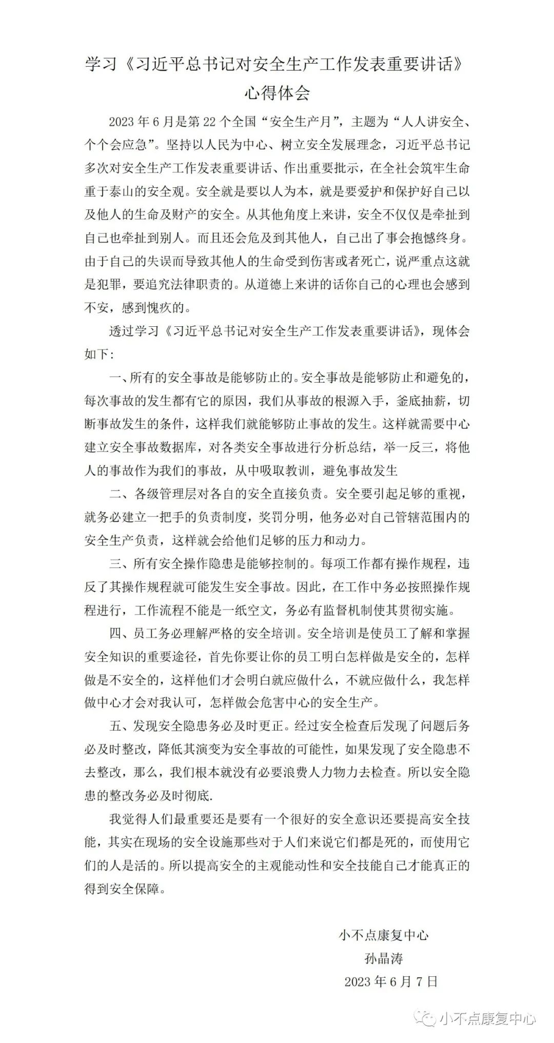 下一步,中心将继续加强全员对安全生产的思想重视。我们将学习总书记关于安全生产的重要论述,加强事前预防工作,压实安全生产责任,做好风险防控。我们将把安全生产工作扎扎实实地落实到实际工作中去,确保中心内训儿童、教职工和财产的安全。同时,我们将全力保障特需儿童的生命健康安全,守牢安全底线,并做好安全生产工作教育和宣传的普及工作,使每一位儿童家长都能成为安全生产的参与者和监督者。