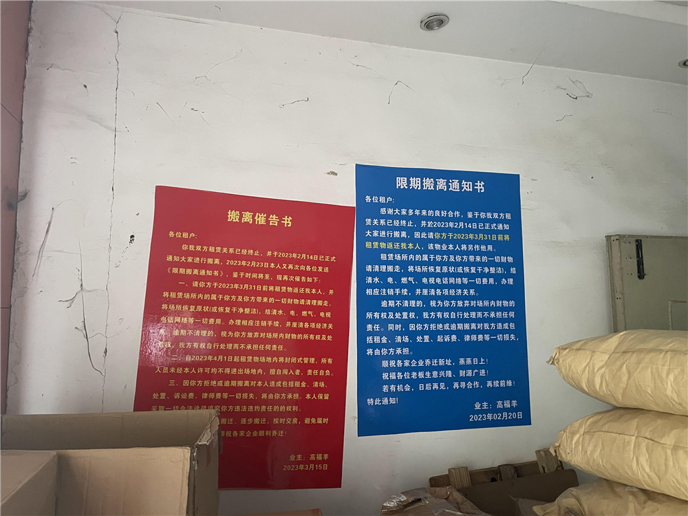 6月25日,记者实地走访了企业注册地址,发现现场大门紧锁,原办公区域堆满了工程塑料。公司旁边的墙壁上贴满了搬离催告书,并画有“拆”字。
