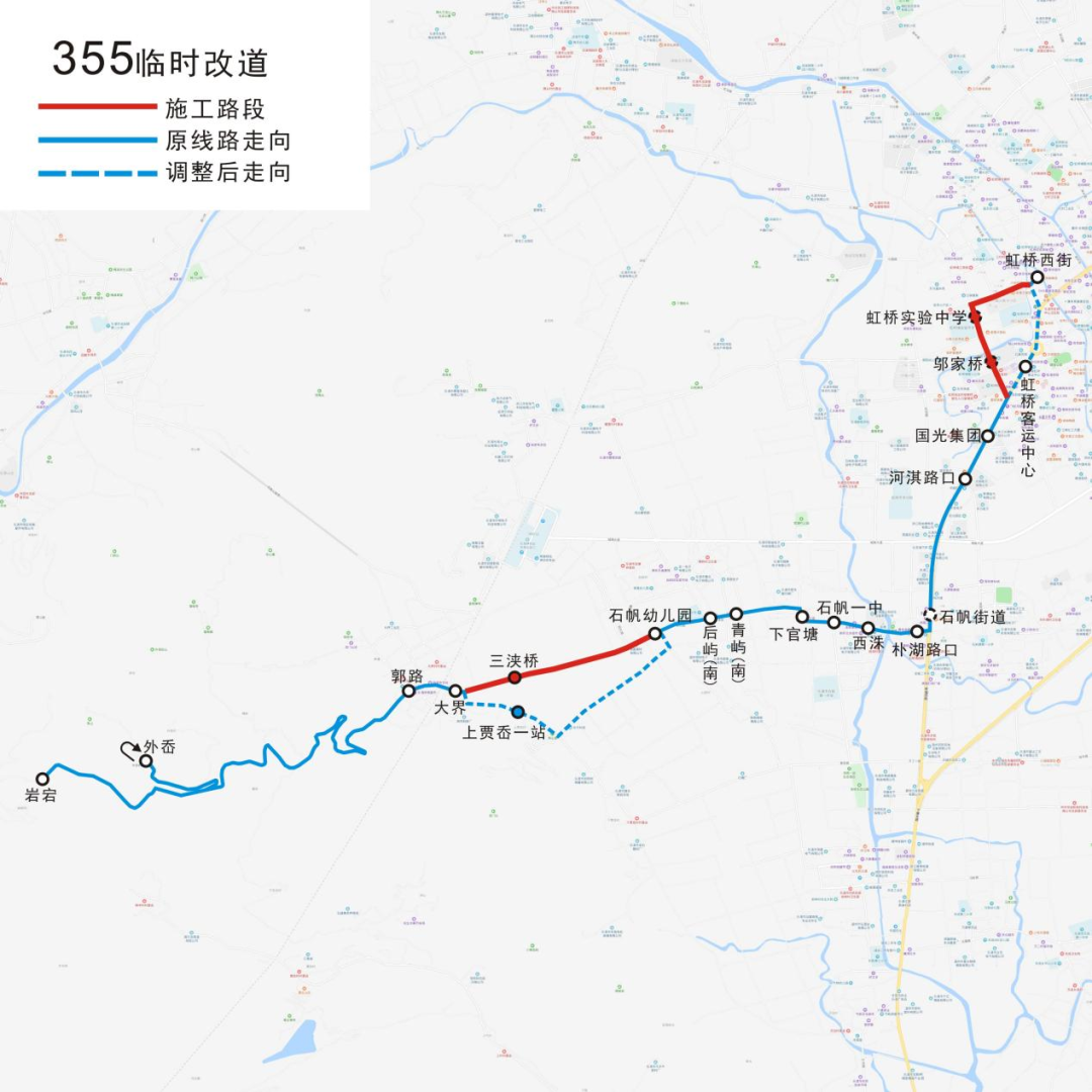 上行路线:虹桥西街→虹桥客运中心→国光集团→河淇路口→朴湖路口→西洙→石帆一中→下官塘→青屿(南)→后屿(南)→石帆幼儿园→上贾岙一站→大界→郭路→外岙→岩宕。