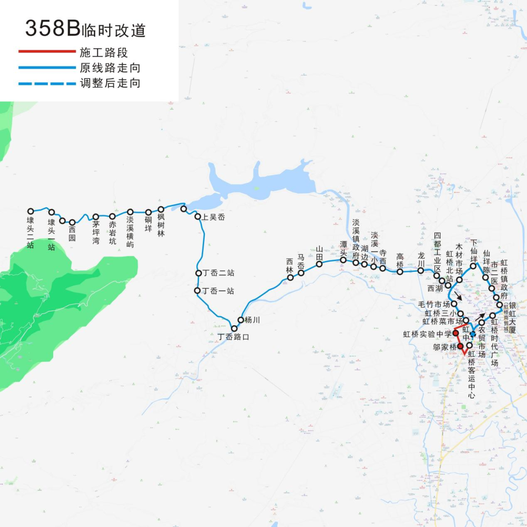 上行:虹桥客运中心、农贸市场、虹桥时代广场、银虹大厦、虹桥镇政府、市二医、仙垟陈、下仙垟、木材市场、虹桥北站、西湖、四都工业区、龙川、高桥、寺西、淡溪一小、湖边、淡溪镇政府、潭头、山田、马岙、西林、杨川、丁岙路口、丁岙一站、丁岙二站、上吴岙、枫树林、硐垟、淡溪横屿、赤岩坑、茅坪湾、西园、埭头一站、埭头二站。 请注意,我没有改变原文的意思。