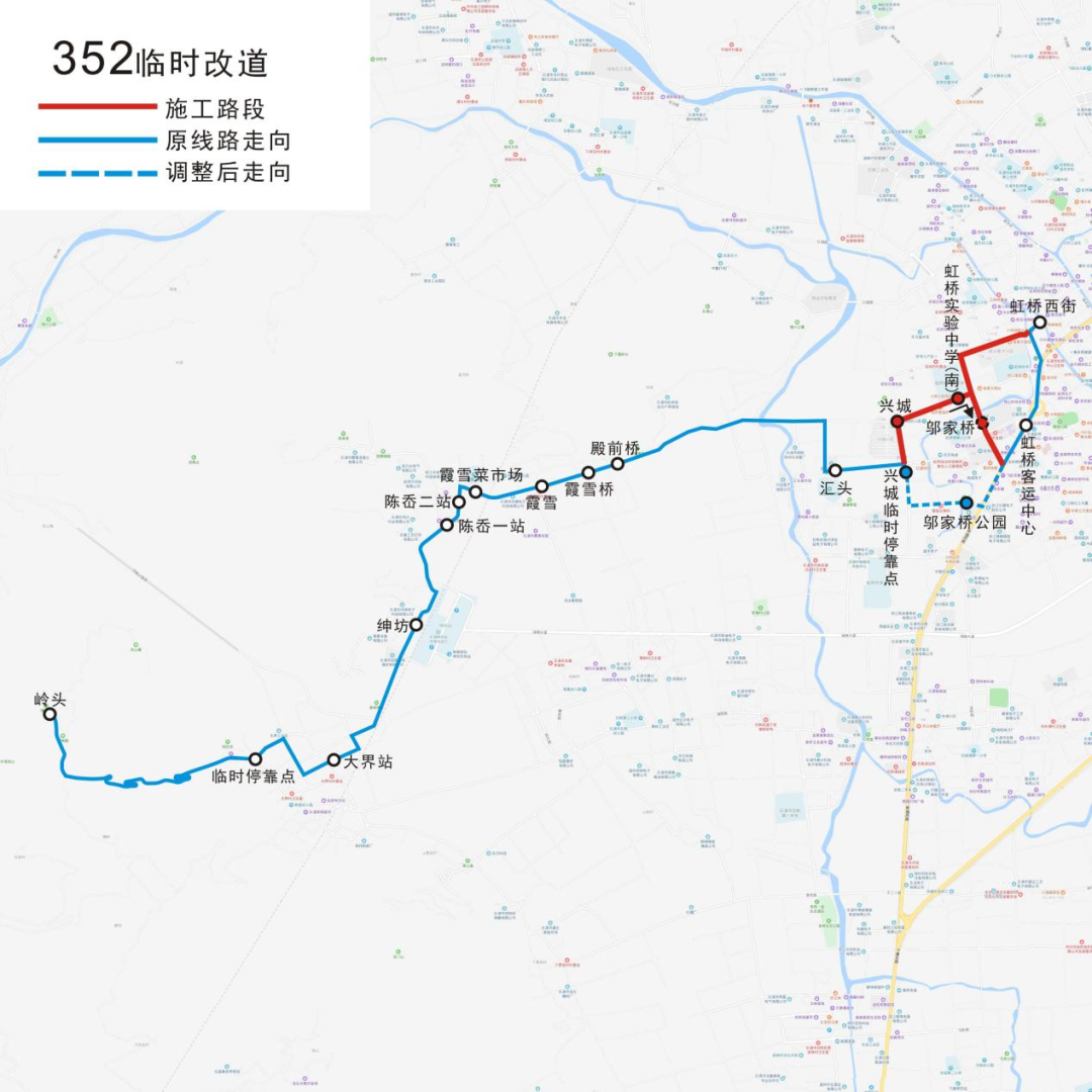 下行:从岭头出发,经过大界站、绅坊、陈岙一站、陈岙二站、霞雪菜市场、霞雪、霞雪桥、殿前桥、汇头、兴城(临时停靠点)、邬家桥公园、虹桥客运中心和虹桥西街。