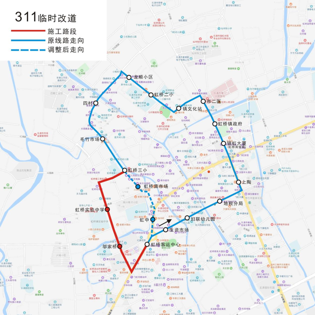 由于虹桥环城西路道路施工,工期为2023年7月1日至2024年1月31日,公交车辆无法正常通行。因此,自2023年7月1日起,乐清公交将临时调整虹桥片区311路、352路、355路、358B路公交线路走向。具体调整如下:311路。