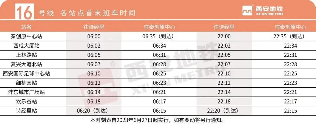 16号线一期的首班车在秦创原中心站发车时间为早上6:00,末班车则在晚上22:00发车。同样地,诗经里站的首班车发车时间为早上6:15,末班车则在晚上22:15发车。该线路全天运营时间为16小时36分钟。