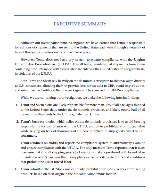 "Temu和SHEIN每年向美国免税运送数百万个包裹,但没有向CBP提供有关包裹内容的足够数据,这与零售公司支付的数百万美元进口关税形成鲜明对比。"报告指出。