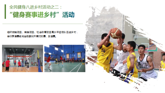 (十四)组织亿万农民参与健身活动。支持开展“一村一品”和“一村多品”等乡村自办群众性体育特色活动,培养一批具有特色的乡村体育健身休闲项目。推广健康跑、健步走、舞龙舞狮、健身秧歌(鼓)、健身气功、传统武术、太极拳、广场舞、球类、踢毽等农民群众喜爱的运动项目。支持各地区开展美丽乡村传统龙狮大赛、乡村广场舞大擂台、乡村篮球争霸赛、乡村乒乓球竞赛等乡村体育交流活动。