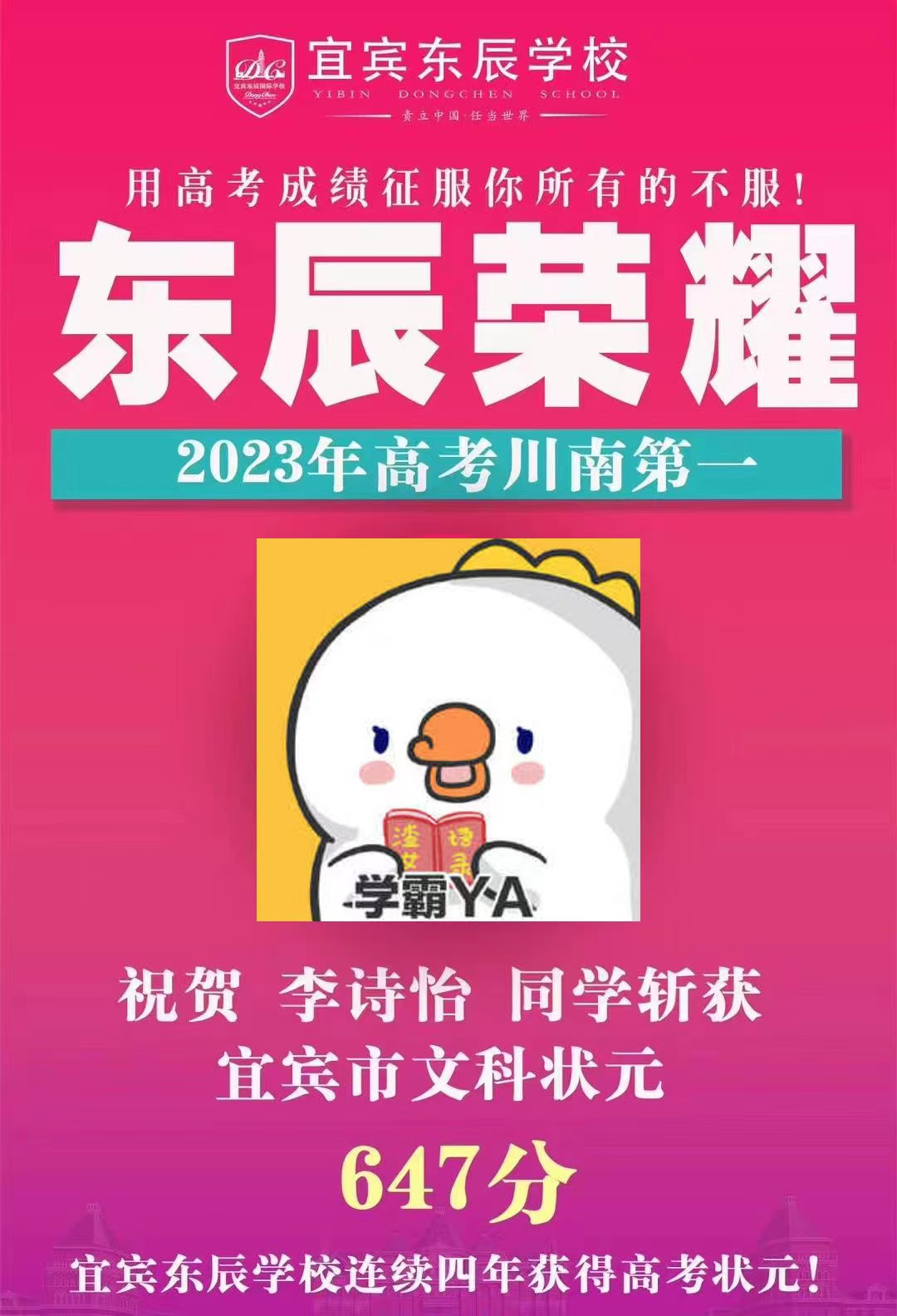 李诗怡同学以647分的优异成绩荣膺宜宾文科第一名;李娜思宇同学以643分的优异成绩荣膺宜宾文科第二名。