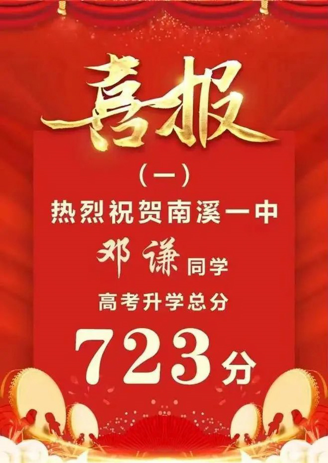 南溪一中每年都有黑马出现。今年,邓谦同学在南一中高考升学总分中取得了723分的好成绩,有望被清华大学录取。该校理科班级的平均分基本在600分以上。