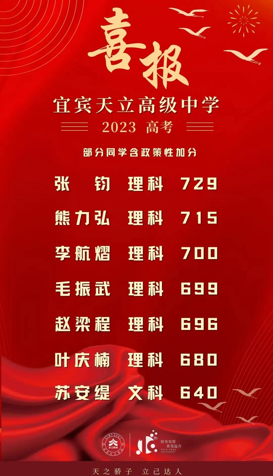 宜宾天立高中理科最高分729分,第二名715分(含政策加分),文科最高分640分!