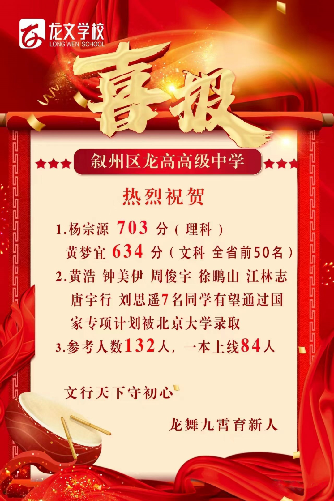 叙州区龙高高中无疑是今年宜宾高中领域的一匹黑马。该校参考人数为132人,其中上一本线的人数高达84人!
