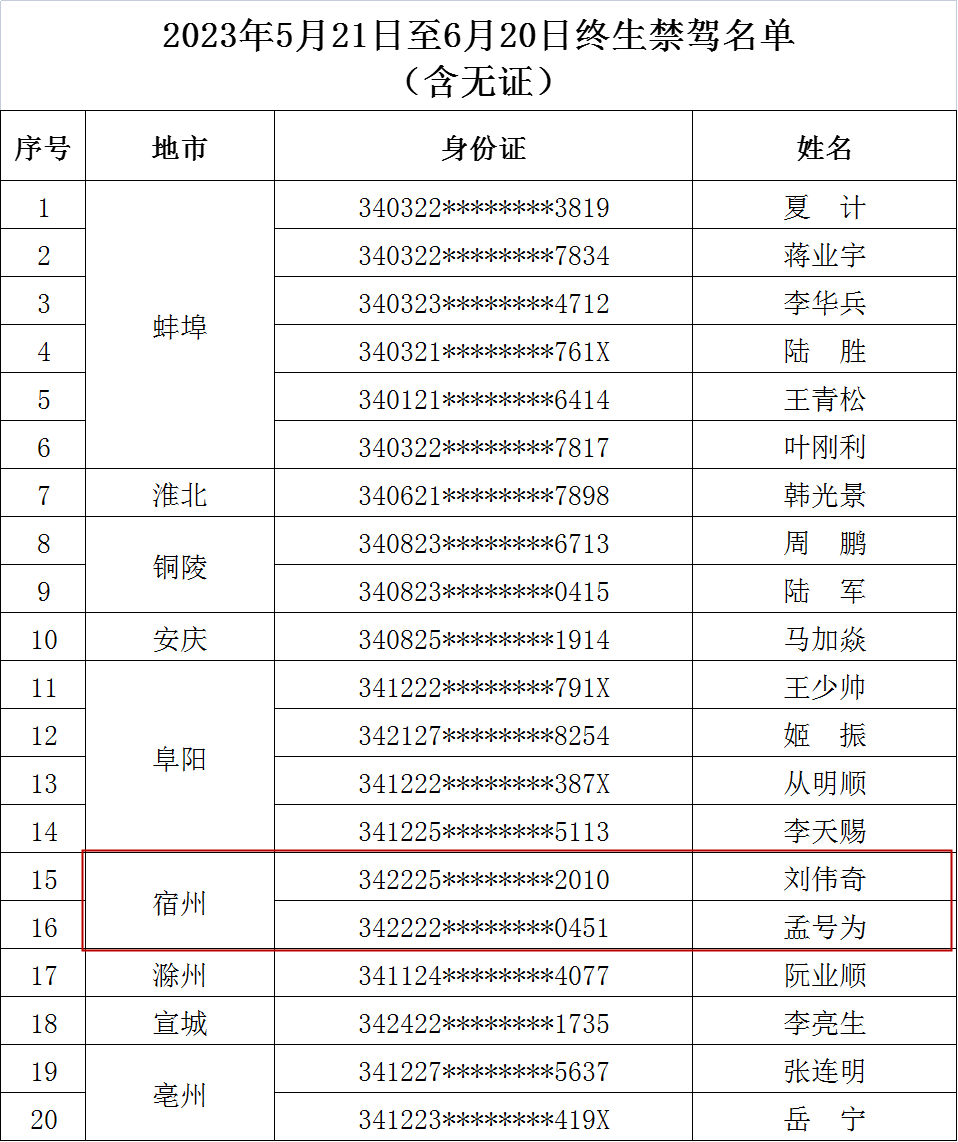 安徽省新增20名终生禁驾人员。