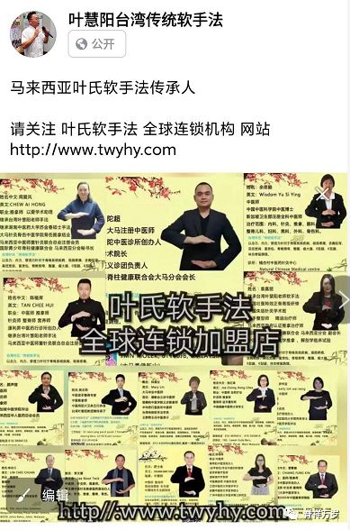 1962年,台湾出生。自幼热爱武术和医学,家族传承和四十多年来丰富的临床经验及教学经验相结合,结合解剖学基础,经过系统整理,特命名为“叶氏软手法”。它运用杠杆力学原理,通过小力度、小角度、小幅度的治疗,针对脊柱肌筋膜卡压造成的身体疾病。