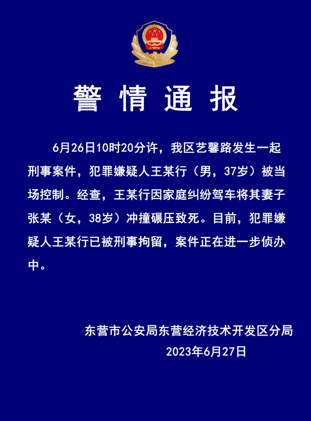 6月27日深夜,山东东营市公安局东营经济技术开发区分局发布了一份通报。根据通报,6月26日10时20分左右,在山东东营经济技术开发区艺馨路,犯罪嫌疑人王某行驾车撞伤了其妻子张某(女,38岁)并碾压了她致死。目前,犯罪嫌疑人王某行已被刑事拘留,案件正在进一步侦办中。