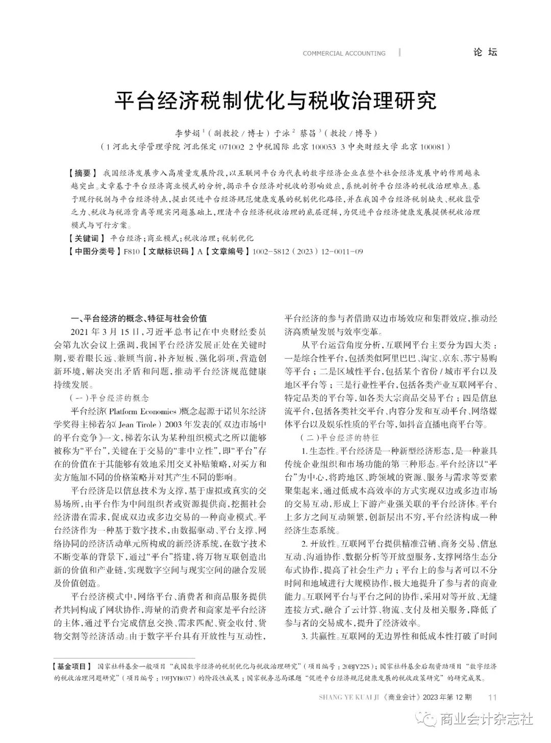 【关键词】平台经济;商业模式;税收治理;税制优化。
