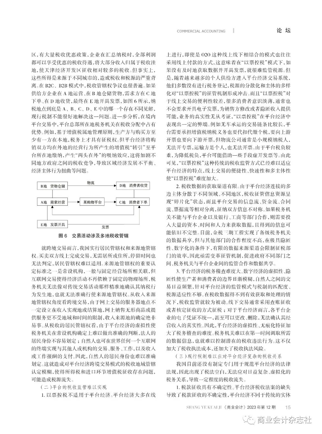 5.模糊的纳税地点导致税收管辖权争议。增值税的纳税地点规定并不适用于互联网平台的交易行为。根据《中华人民共和国增值税暂行条例》第二十二条和《营业税改征增值税试点实施办法》第四十六条规定,个人通过互联网销售服务或商品时,应向销售货物或服务行为发生地主管税务机关申报纳税。如果未申报纳税,居住地主管税务机关将补征税款。由于平台只是媒介,个人可以在不同城市从事经营并使用互联网商业技术,如VPN技术,使得应税行为发生地难以确定。平台经济涉及复杂的税收管辖问题,增加了税收征管难度。税收管辖权无论是在境内交易还是跨境交易中都是一个重要问题。例如,滴滴出行的运营模式涉及连接供需双方在我国境内多个城市的情形。由于滴滴总部位于天津经济开发区,享受大量税收优惠政策,企业在汇总纳税时可享受优惠税收待遇,将大部分收入归属于税收洼地,导致天津经济开发区征收相对较多的税收。然而,这些收入实际上来源于不同城市的不同居民,造成了税收和税源的严重背离。在B2C和B2B模式中,税收管辖权争议也很普遍。如果供给方企业在A地运营、在B地仓储货物,需求方在C地下单、在D地收货,最终在E地开具发票,如图6所示,纳税地点到底是A、B、C、D、E中的哪一个存在不同见解,现行税制无法解决这一问题。进一步分析发现,在境内平台交易中,平台总部所在地税务机关在税收分配中占有优势。例如,基于增值税属地管理原则,生产方与购买方至少有一方在本地,税务上才具有征税权。但平台经济将购销双方均在外地的经营行为所产生的增值税“转引”至平台所在地缴纳,产生“两头在外”的吸纳效应,这将加剧不同地方政府之间的税收竞争,导致区域经济发展不平衡、经济主体行为扭曲等问题。