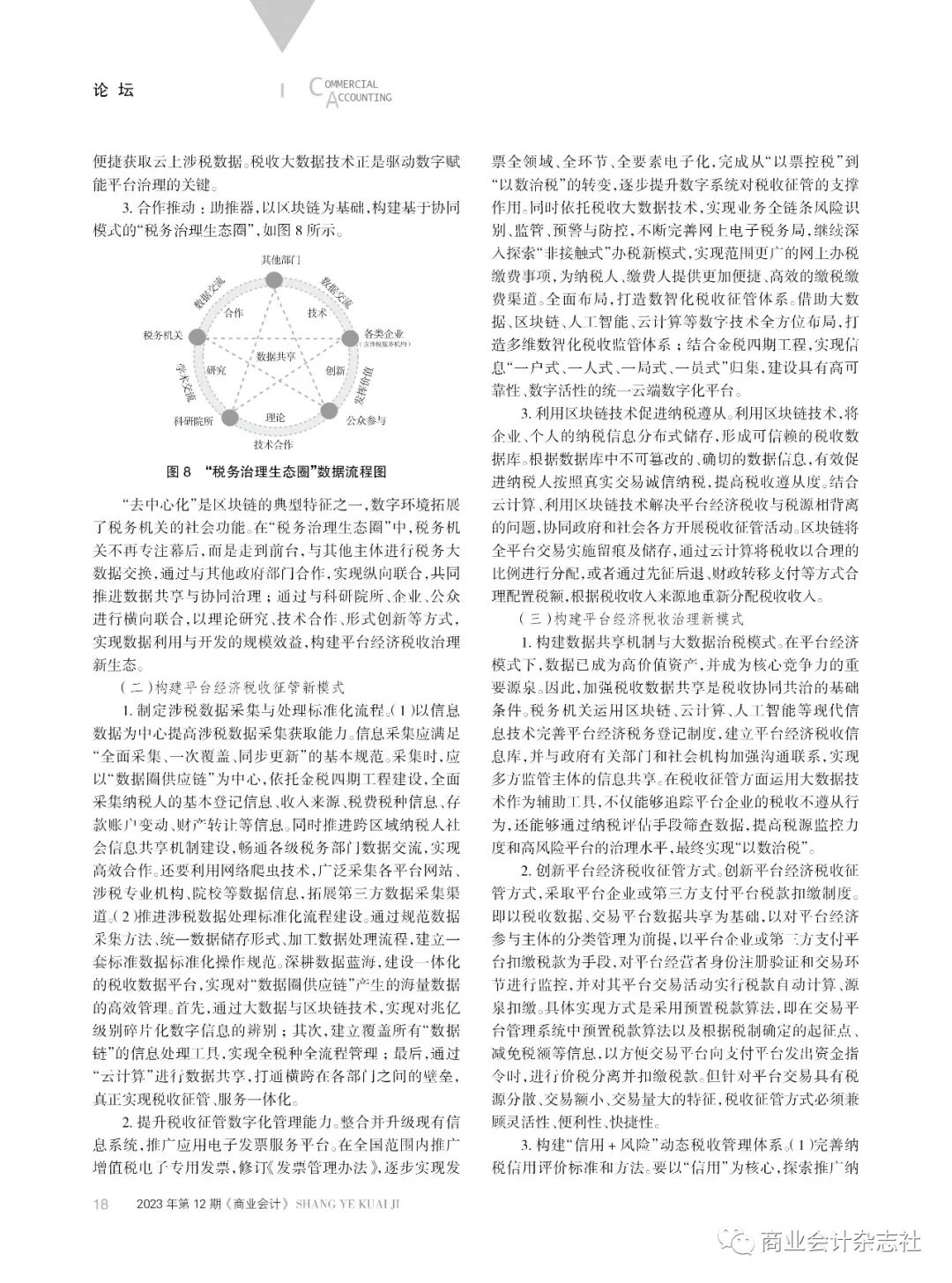 2.技术驱动:发动机。随着数字时代的到来,数字治理应运而生。数字治理的核心工具是大数据技术。在税收治理中,税收大数据的挖掘利用成为影响税收治理质效的关键。税收大数据是指与各税种相关的数据、信息的集合。税收大数据技术通过区块链、云计算、人工智能、物联网等技术对税收大数据进行分析处理。数字技术的发展与应用促进了税收征管体制改革,革新了税务管理方式,创新了不同场景下税务信息的利用形式。数字化阶段,数字技术不仅作为辅助工具,更作为生产工具创造价值。在基础设施建设方面,利用移动客户端实现移动办税,通过数据分析实现个性化精准推送;基于人工智能技术,将专家知识与机器学习相结合,实现动态风险监控,从事后管理向事前、事中、事后立体化管理模式转变;运用区块链技术搭建多方协作平台,实现数据信息流畅通传输,让数据“活起来”;通过云计算便捷获取云上涉税数据。税收大数据技术是驱动数字赋能平台治理的关键。