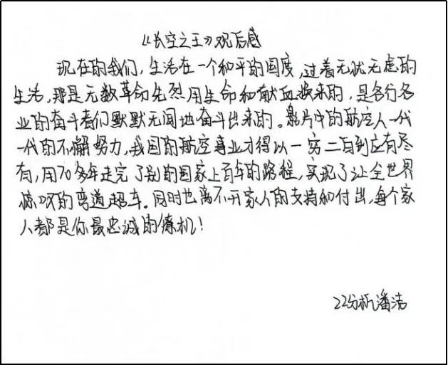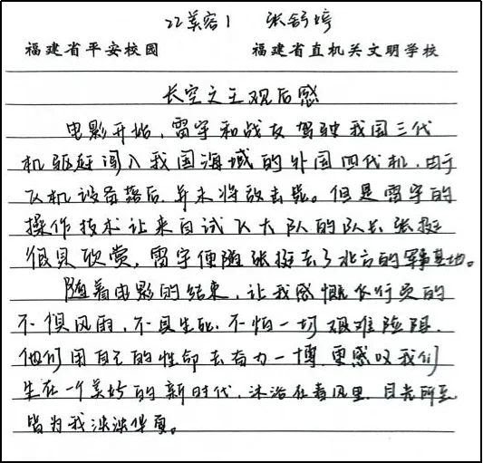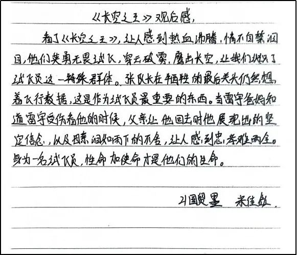 晚上,我们组织了一场活动,邀请了教导大队留校军事竞赛的队员们一起观看电影《长空之王》。观影结束后,队员们纷纷感慨不已,并提笔写下了观后感。