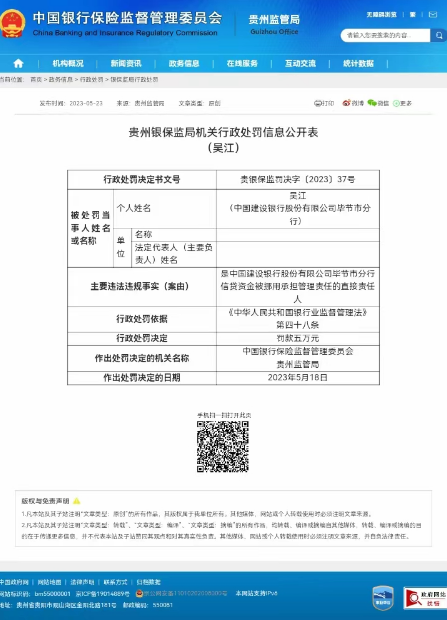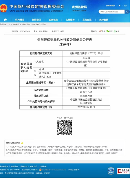 根据国家金融监督管理总局网站披露的消息,中国建设银行毕节市分行因违规收费,对直接责任人朱荣祥处以5万元罚款。