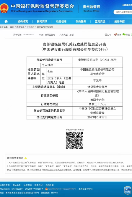 根据国家金融监督管理总局网站公布的行政处罚信息,中国建设银行毕节市分行因信贷资金被挪用而受到监管部门的罚款30万元。同时,吴江作为中国建设银行毕节市分行信贷资金被挪用的直接责任人,也受到了监管部门的罚款5万元。