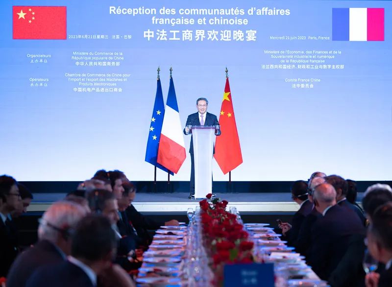 当地时间6月21日晚,国务院总理李强在巴黎出席了一场中法工商界晚餐会。在会上,他发表了讲话。新华社记者黄敬文拍摄了照片。