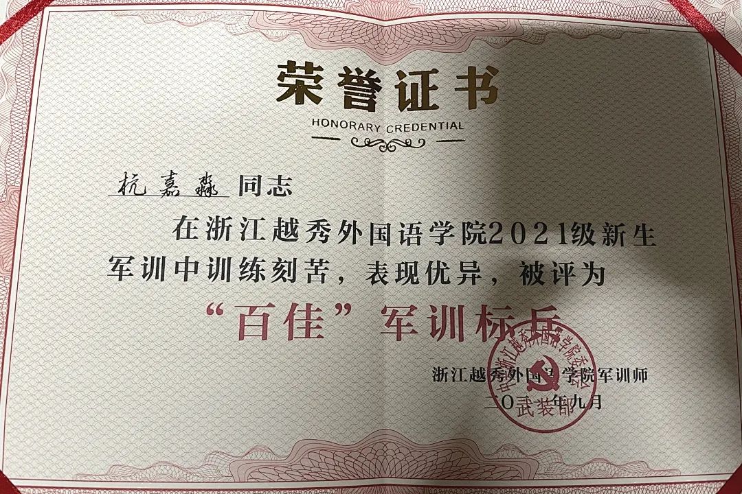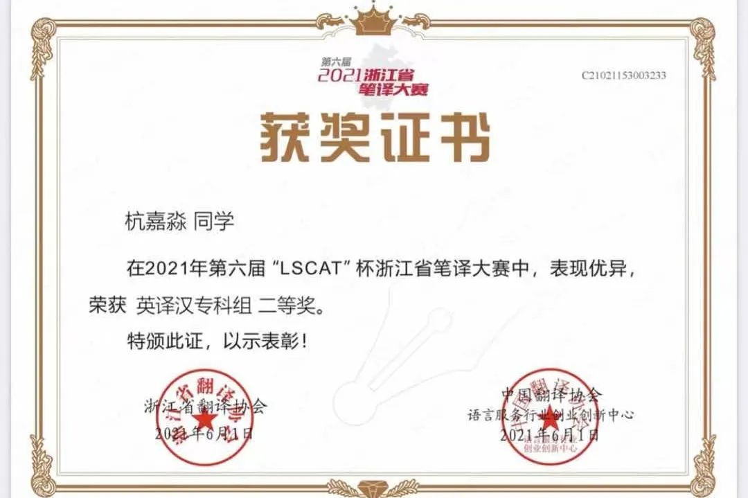 我的获奖经历主要包括:荣获市级优秀毕业生、大一大二学年校优秀SPT二等奖奖学金、优秀SPT团学干事、优秀SPT团学干部、第六届LSCAT杯浙江省笔译英译汉二等奖、第四届“寻找人海中的小金人”话剧大赛最佳人气奖、“学习贯彻雷锋精神”征文比赛一等奖和“百佳”军训标兵等荣誉。