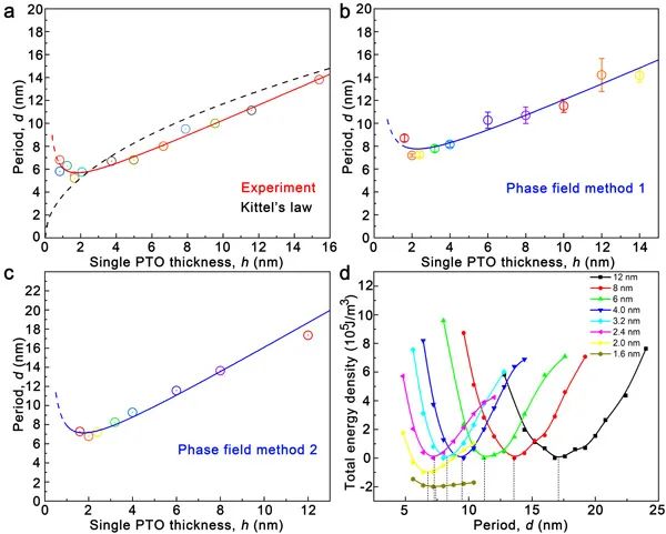 这项工作不仅证实了著名的Kittel定律在含有斯格明子的超薄PbTiO3/SrTiO3超晶格中并不成立,而且还发现斯格明子可以在两个单胞厚的PbTiO3/SrTiO3超晶格和双层膜中保持。实验和理论结果都表明,超晶格中斯格明子周期(d)和单一PbTiO3层的厚度(h)服从双曲函数d=Ah+B/h,而非平方根定律。相场分析表明,异常的周期-厚度关系主要取决于块体能、弹性能、静电能和梯度能之间的相互竞争。这一发现澄清了自九十年代以来铁电材料领域关注的拓扑结构临界尺寸研究中的一个重要基础性科学问题。