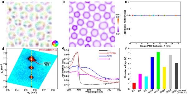图4.(a-c)展示了斯格明子的拓扑数。(d)是[(PbTiO3)7/(La0.7Sr0.3MnO3)7]10超晶格的倒易空间图。(e)是紫外吸收测量。(f)展示了不同厚度超晶格的矫顽电压。
