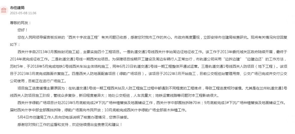 今年5月初,兰州市住建局在网上回复了市民关切的西关什字工程进展。