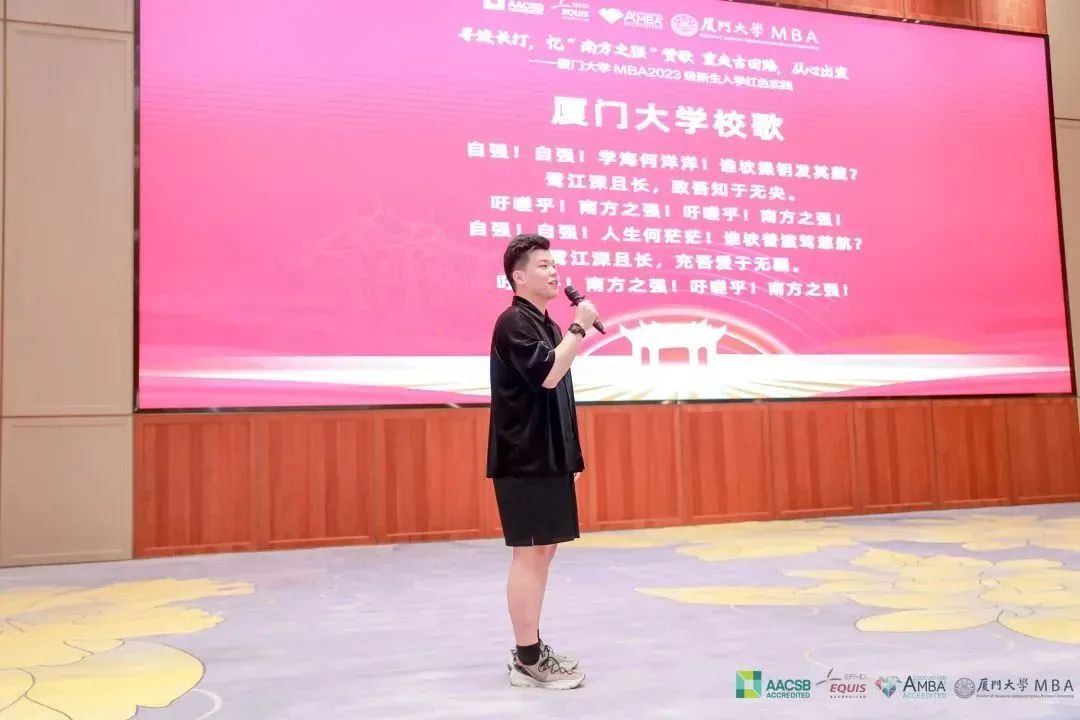 厦门大学校歌悠扬地在现场回荡。厦门大学艺术学院的学生徐江涛和管理学院的兼职辅导员李奕凡带领23级MBA新生学唱校歌。“致吾知于无央,充吾爱于无疆”,这不仅是宣言、号召和激励。南方之强的办学理念和教育内涵都蕴藏在新一届MBA学子的歌声中。