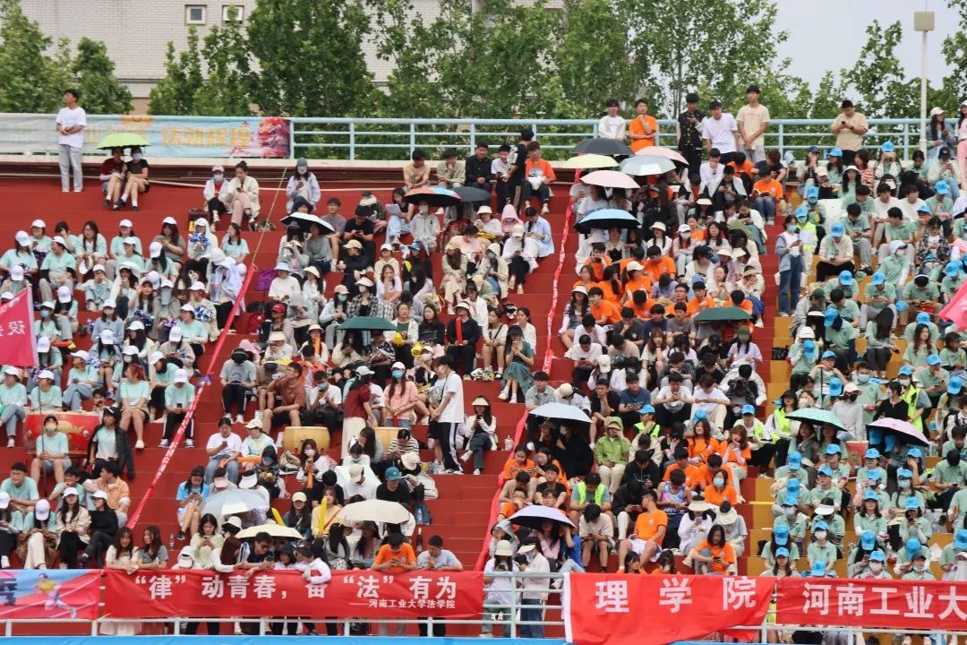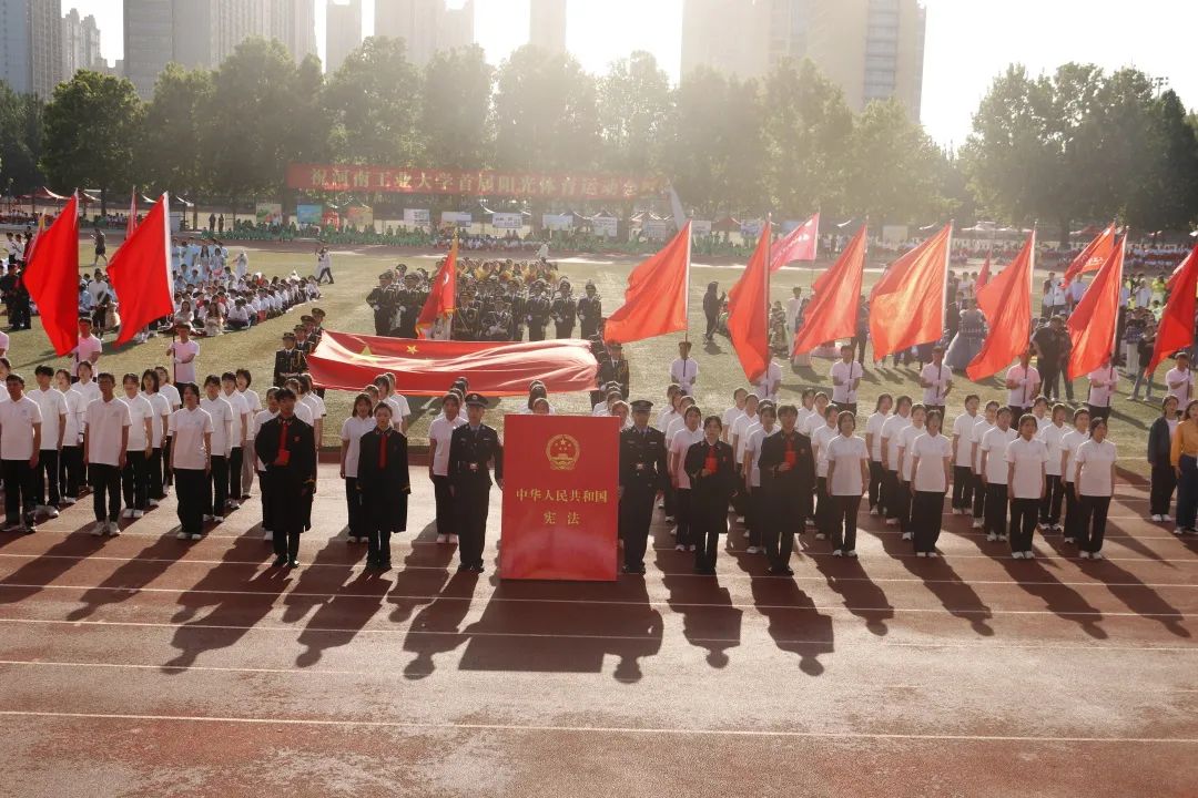 五月的清晨阳光明媚,喜悦和激动在操场上空回荡。在雄壮的《运动员进行曲》音乐声中,法学院师生代表队在院党委书记韩永刚、院长张道许和党委副书记许文的带领下入场。法学院教职工代表手持《宪法》,满怀荣光。学生代表身着法袍和警服,英姿飒爽,气宇轩昂,高举拼接成巨大的“宪法”红色读本,与现场红色跑道交相辉映。