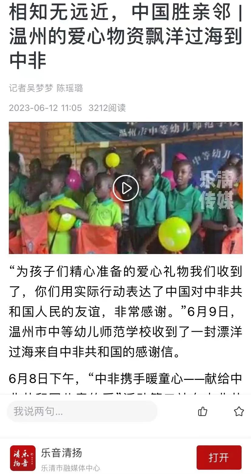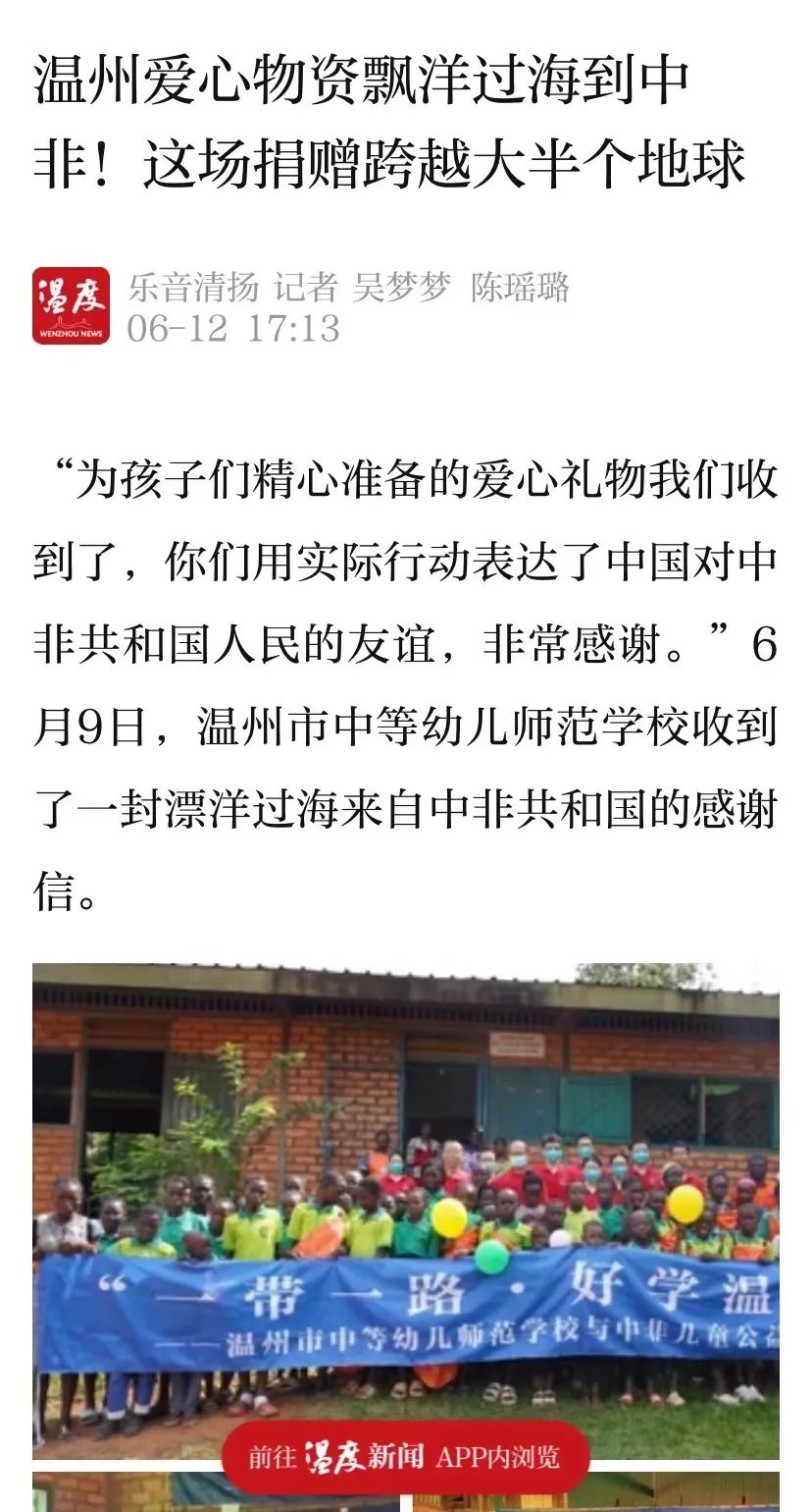 6月8日下午,“中非携手暖童心——献给中非共和国儿童的爱”活动第二站在中非共和国首都班吉湍流中学成功举办。主办方向中非共和国学生们捐赠了爱心和祝福,并提供了课桌椅、书本、文具等教学物资。孩子们收到礼物后,脸上露出了欢快的笑容,激动地高声欢呼。现场气氛活跃,这批物资中的一部分来自温州幼师,而购买物资的所有善款都是我校学生通过自编自演儿童剧服务社会、义卖自制手工作品筹得的。