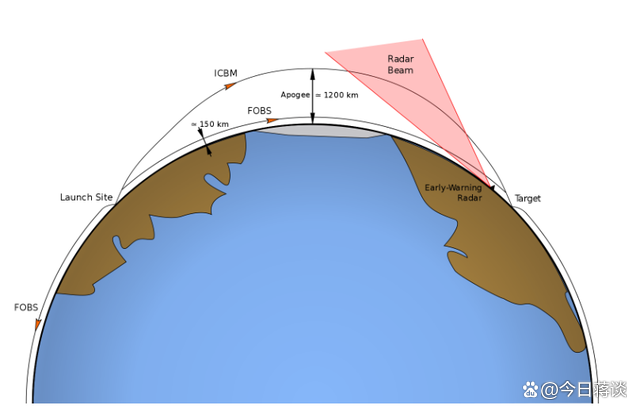 近地轨道轰炸(FOBS)与洲际导弹轨道的对比。