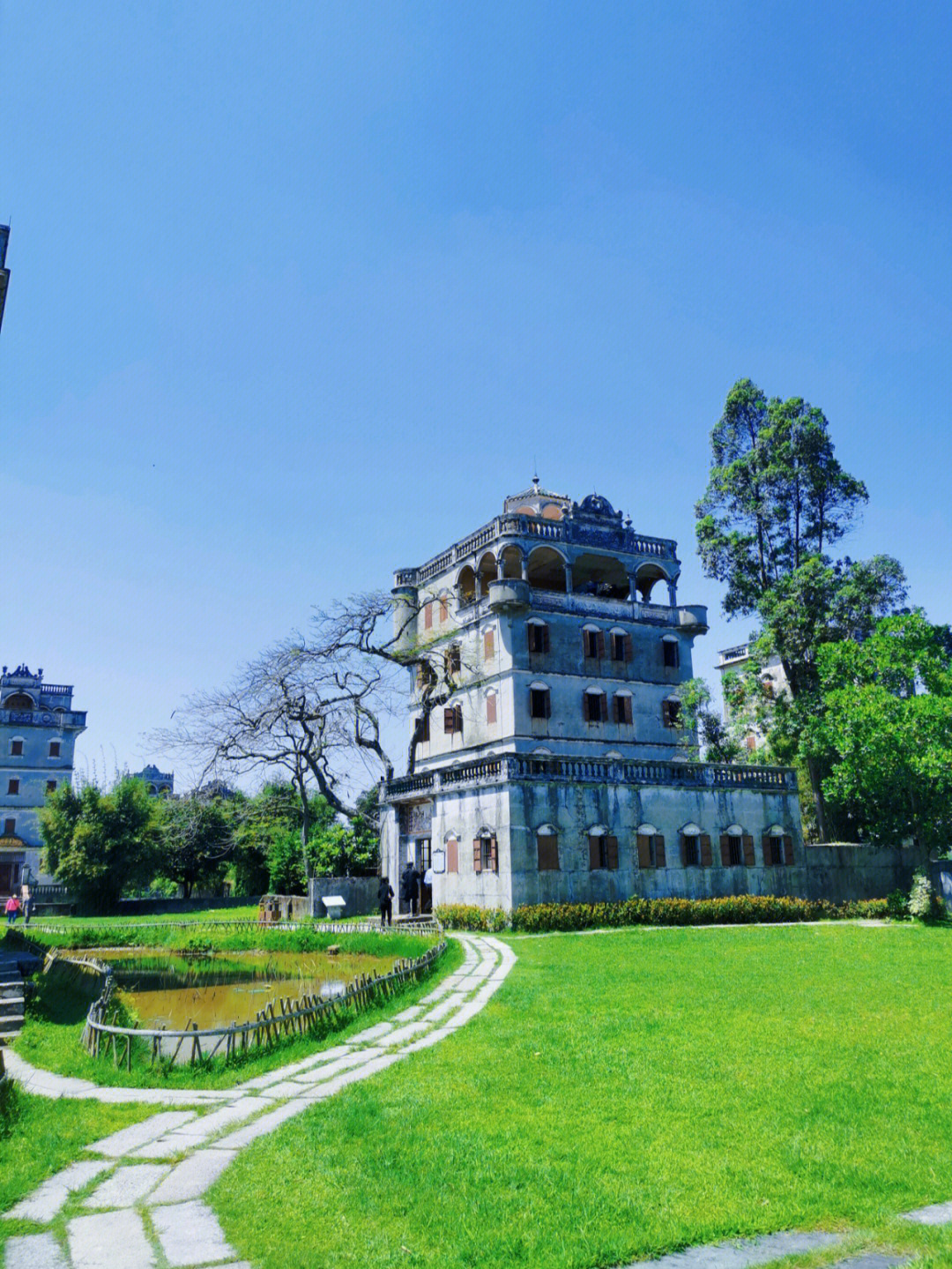 夏天的碉楼,蓝天白云,池塘边鸭子成群,大人们带着孩子在乡村石板路上奔跑,一切都生机勃勃。初夏的五一小长假,天气晴朗,一扫前几日的阴雨天气,开平碉楼各大景区游客纷至沓来,游人如织,沉醉在碉楼的美景中。