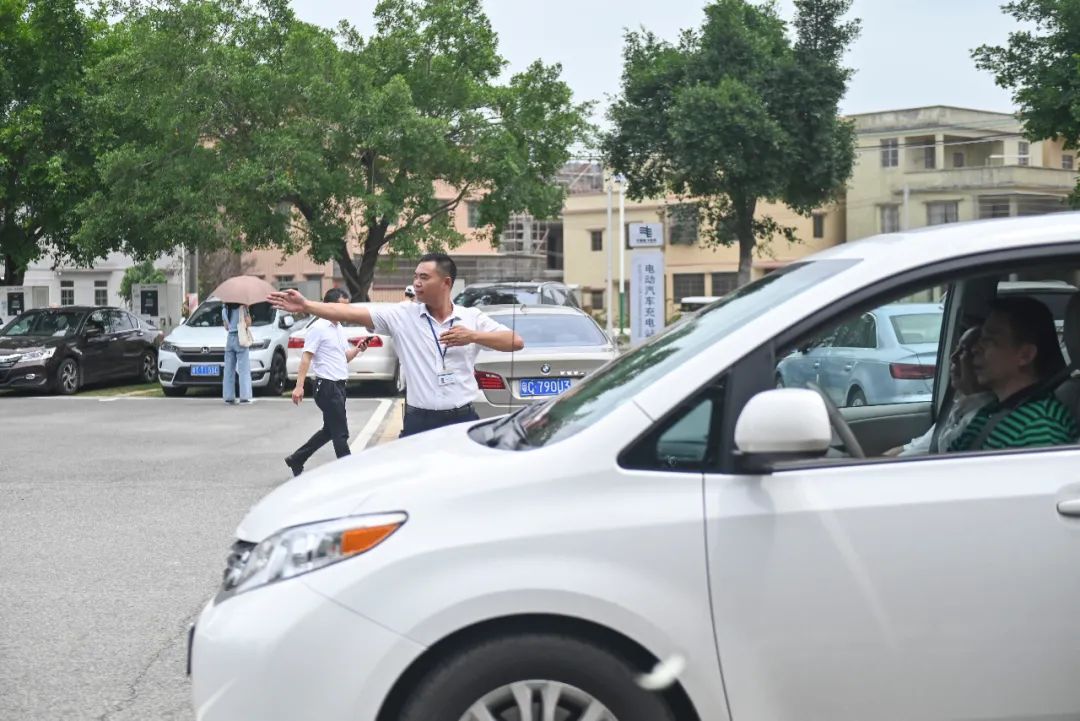 车场指挥员在景区路口和停车场有序地指挥车辆疏导交通,以便游客能够快速到达景区参观。