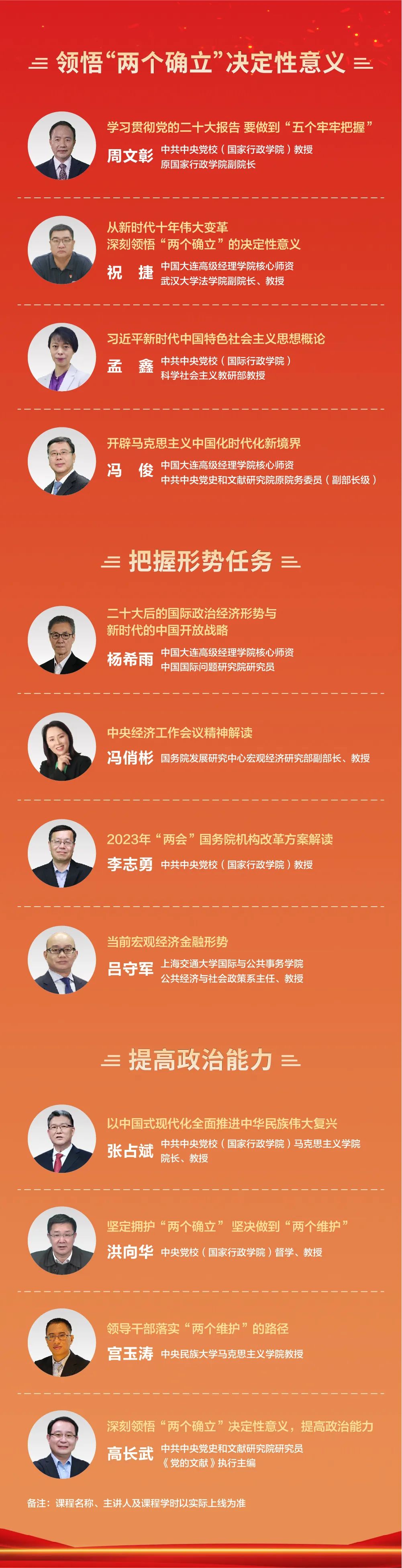 本期专题班聚焦深刻领悟“两个确立”的决定性意义、领导干部带头做到“两个维护”、学习贯彻党的二十大精神、提高政治判断力、政治领悟力、政治执行力,以及把握宏观形势等重点内容。这些内容设置课程,帮助国有企业广大党员干部切实把对“两个确立”的深刻领悟转化为坚决做到“两个维护”的高度自觉。结合形势任务,立足岗位职责,不断提高政治能力,推动国有企业高质量发展。