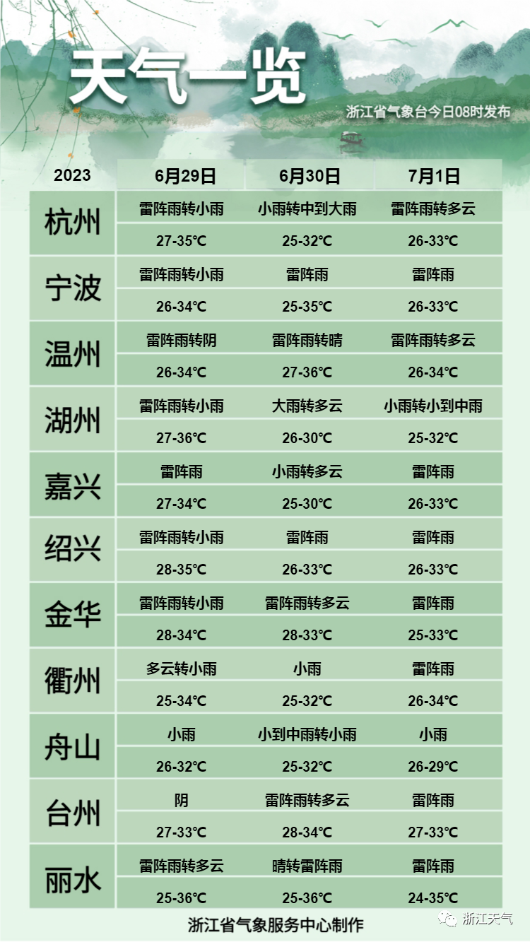 后天,浙北地区多云转阴,有时会有阵雨或雷雨。其它地区则以多云为主,午后局部地区可能会出现阴天并伴随阵雨或雷雨。