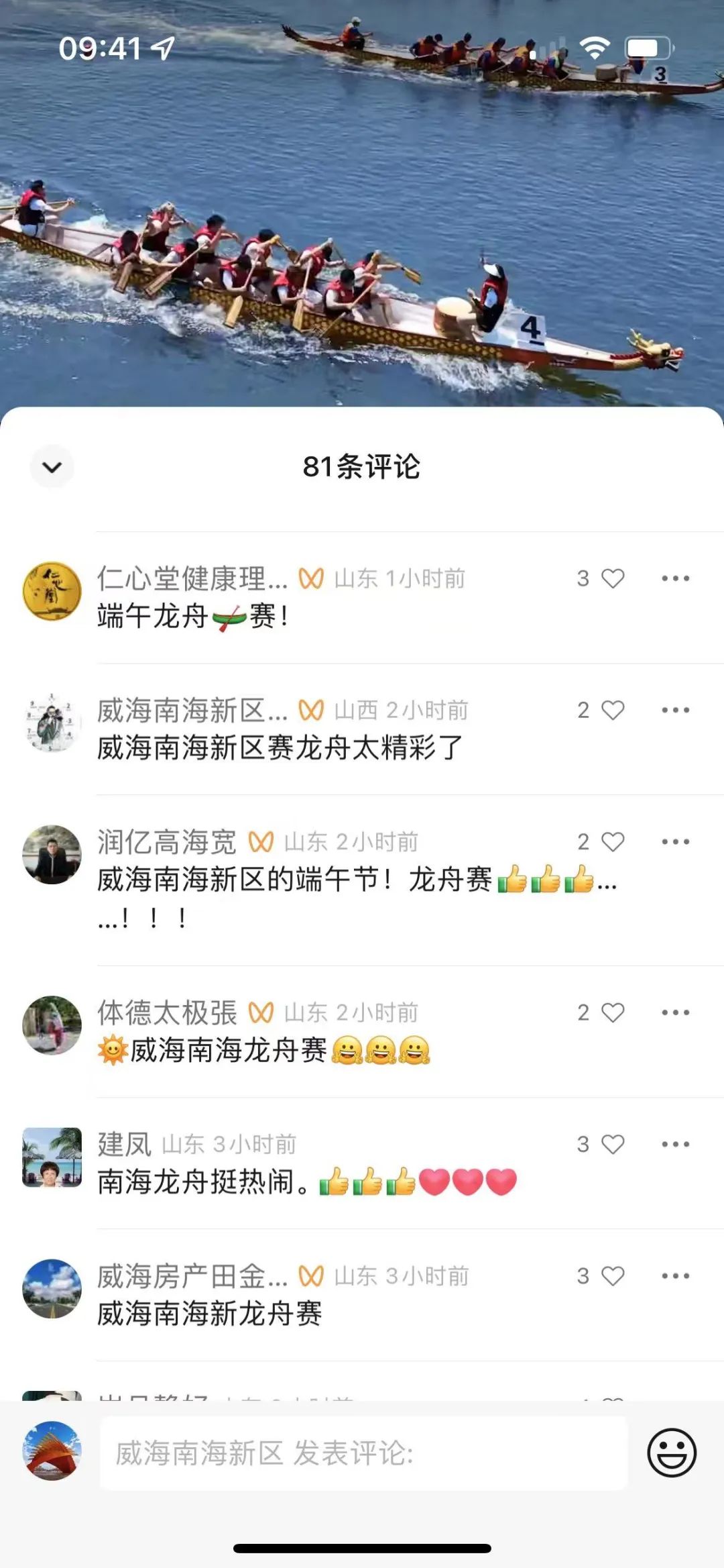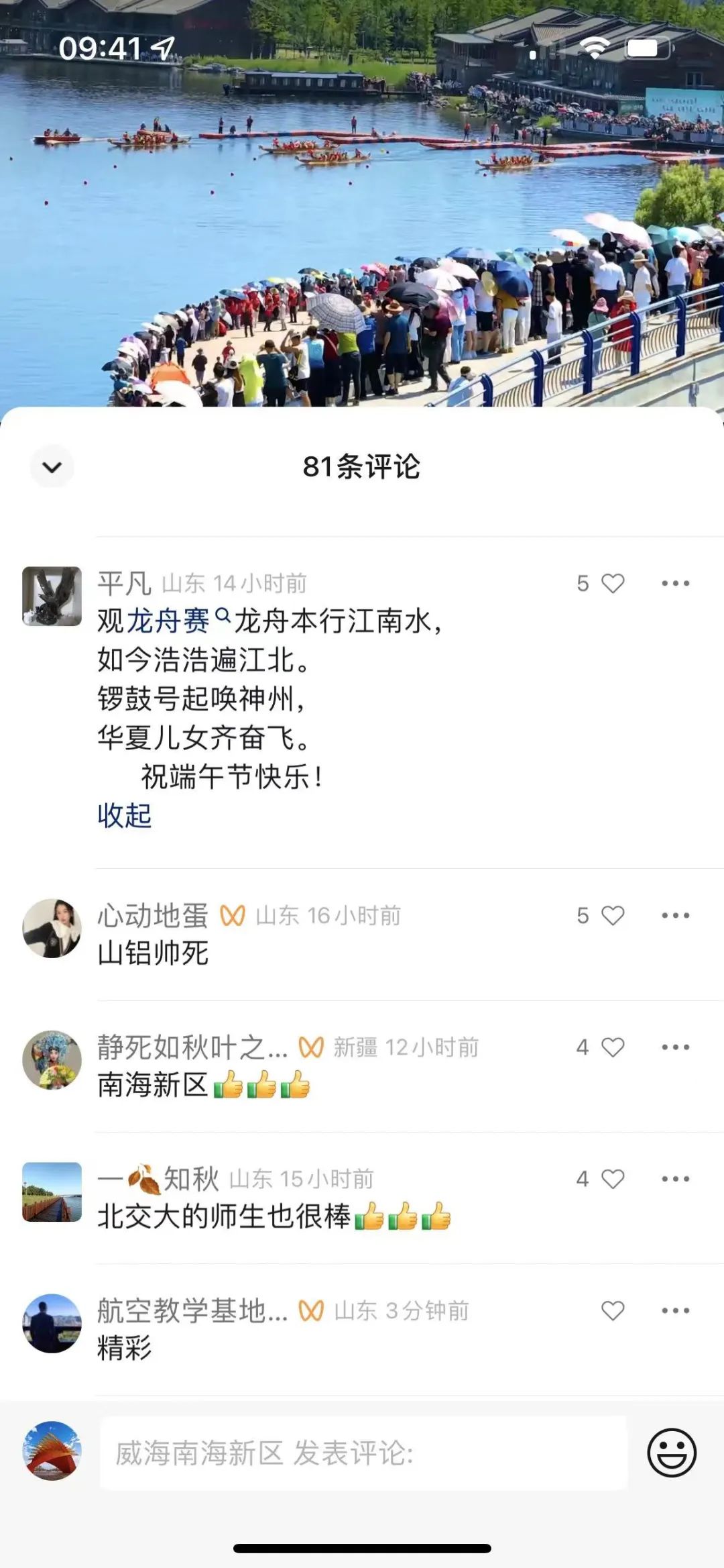 激情澎湃的龙舟赛吸引了众多来自全国各地的观众。大家通过线上线下不同的方式为参赛队伍加油助威:“家门口的龙舟赛让身处异乡的朋友羡慕不已!”“威海南海新区赛龙舟太精彩了!”大家纷纷在评论区留言,为南海新区点赞,为精致幸福家园加油!