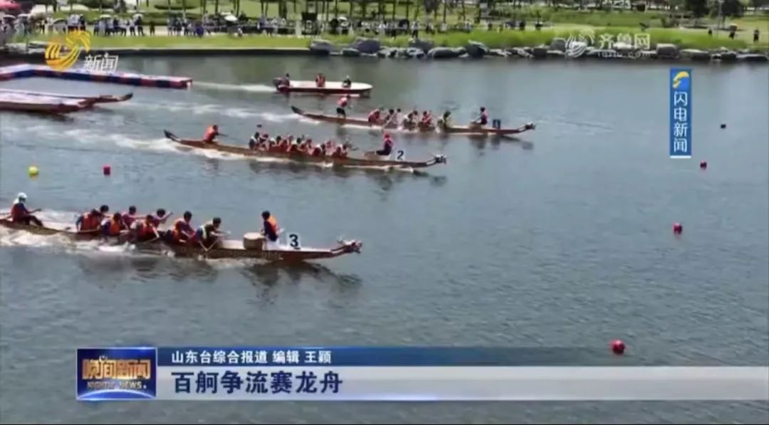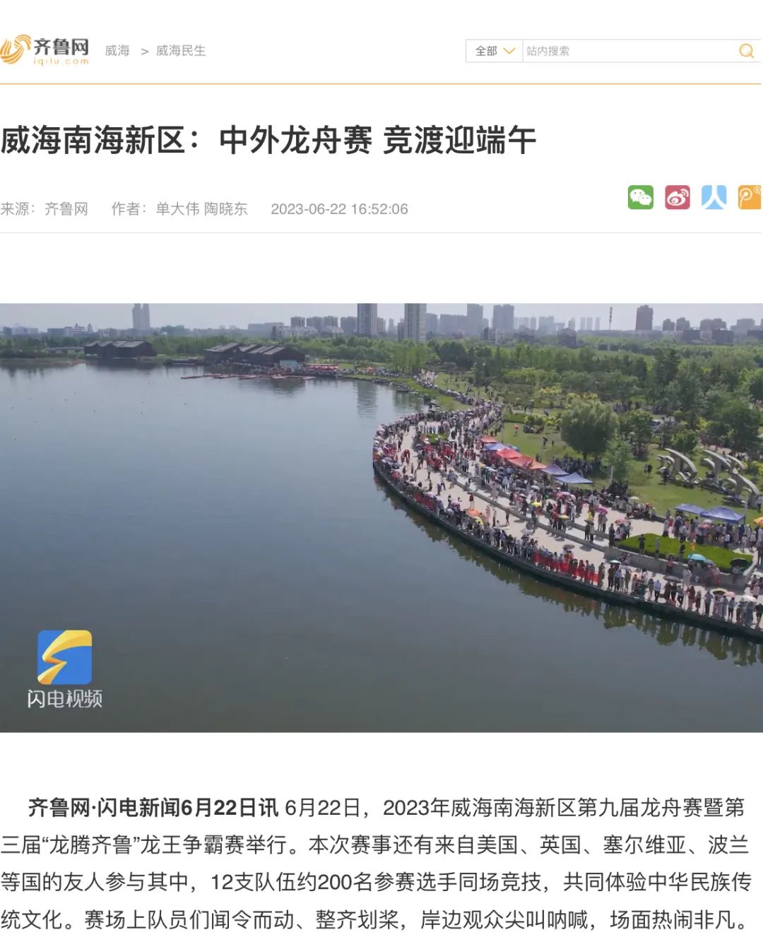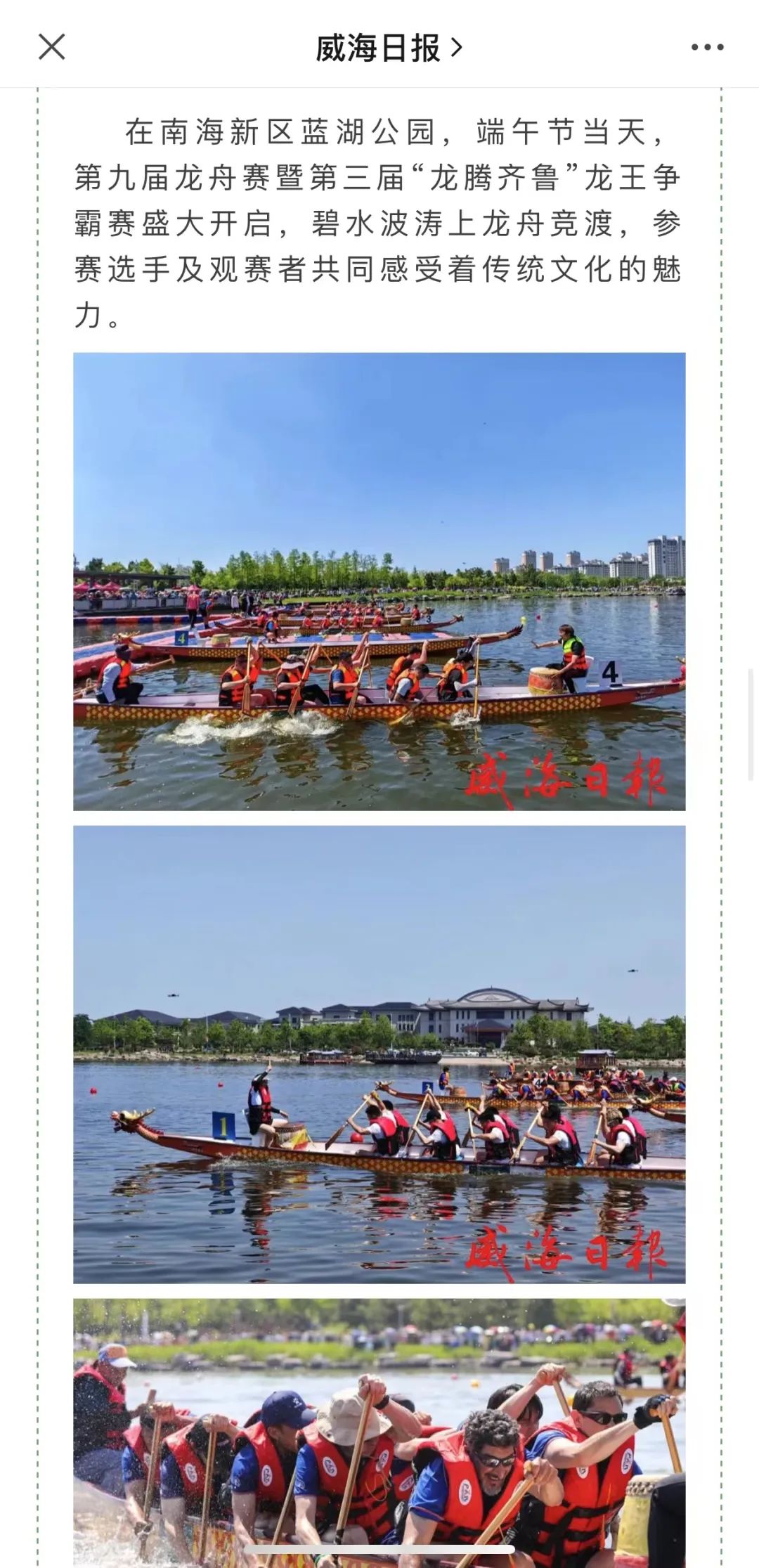 6月22日,端午节,南海新区第九届龙舟赛暨第三届“龙腾齐鲁”龙王争霸赛在蓝湖公园隆重举行。12支参赛队伍的选手们在鼓声中奋力划桨,争先恐后,旗帜飞舞,浪花飞溅。一条条龙舟乘风破浪,勇往直前,吸引了岸边观众的加油呐喊。岸边早已人满为患,吸引了中央电视台、山东电视台、威海电视台等各级媒体的密集播报和十余家媒体的关注报道。