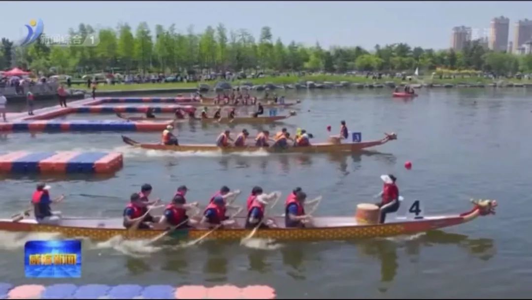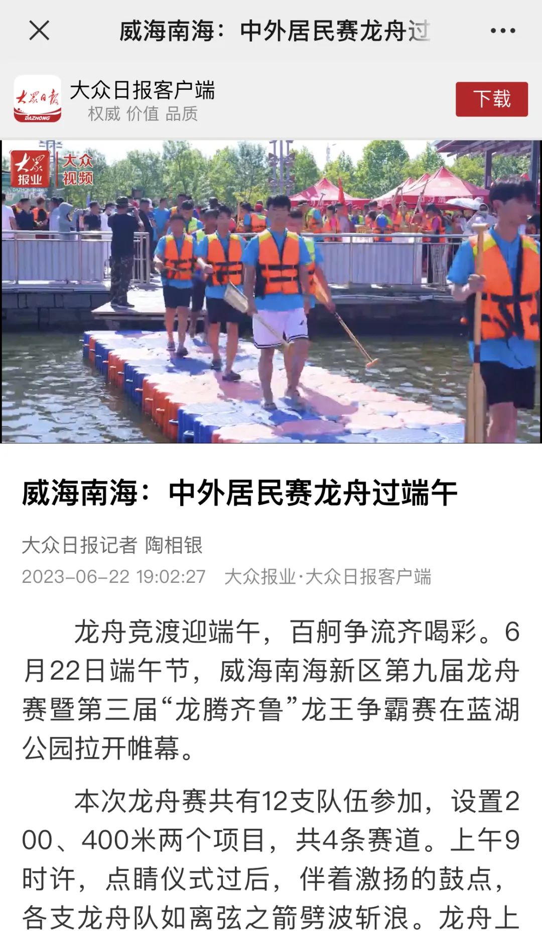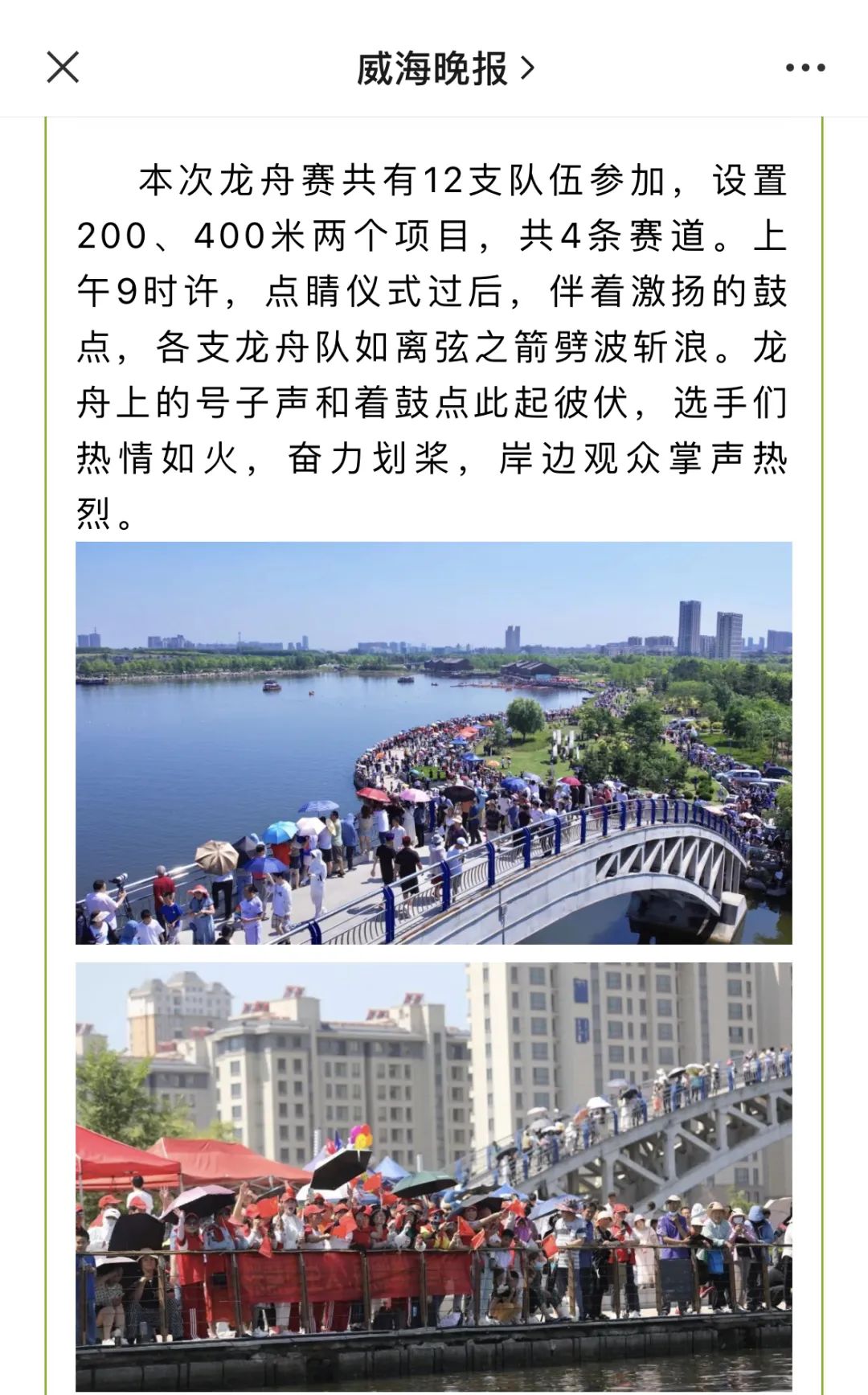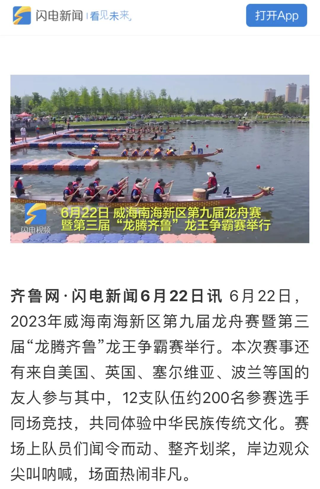 6月22日,端午节,南海新区第九届龙舟赛暨第三届“龙腾齐鲁”龙王争霸赛在蓝湖公园隆重举行。12支参赛队伍的选手们在鼓声中奋力划桨,争先恐后,旗帜飞舞,浪花飞溅。一条条龙舟乘风破浪,勇往直前,吸引了岸边观众的加油呐喊。岸边早已人满为患,吸引了中央电视台、山东电视台、威海电视台等各级媒体的密集播报和十余家媒体的关注报道。
